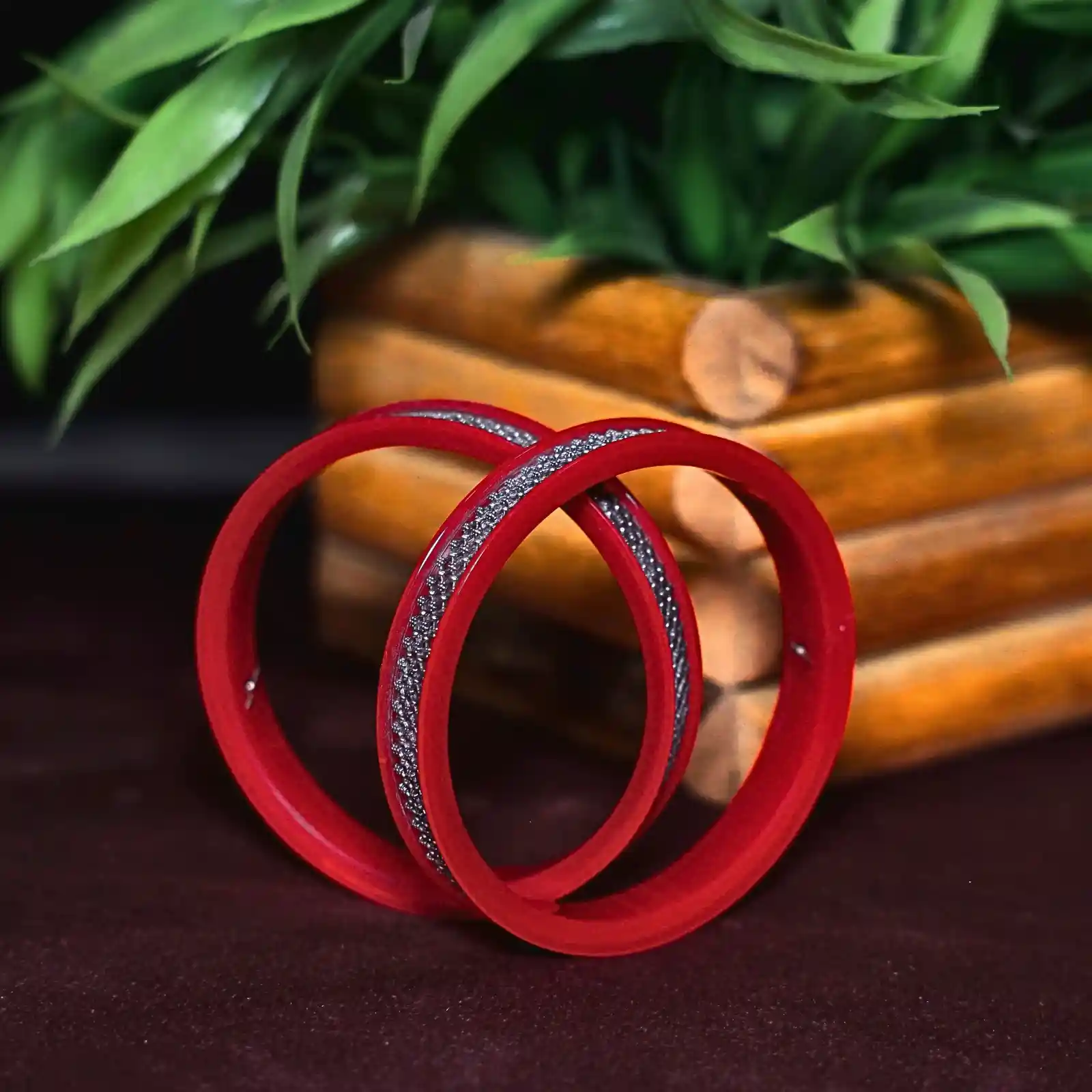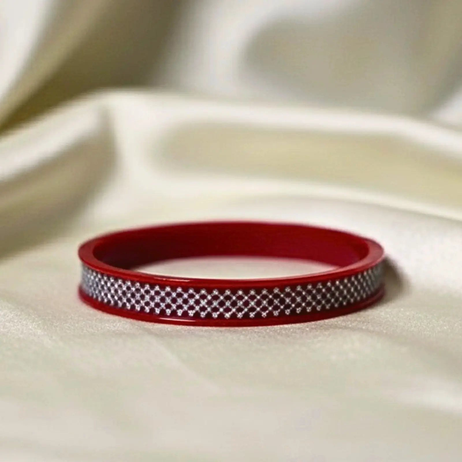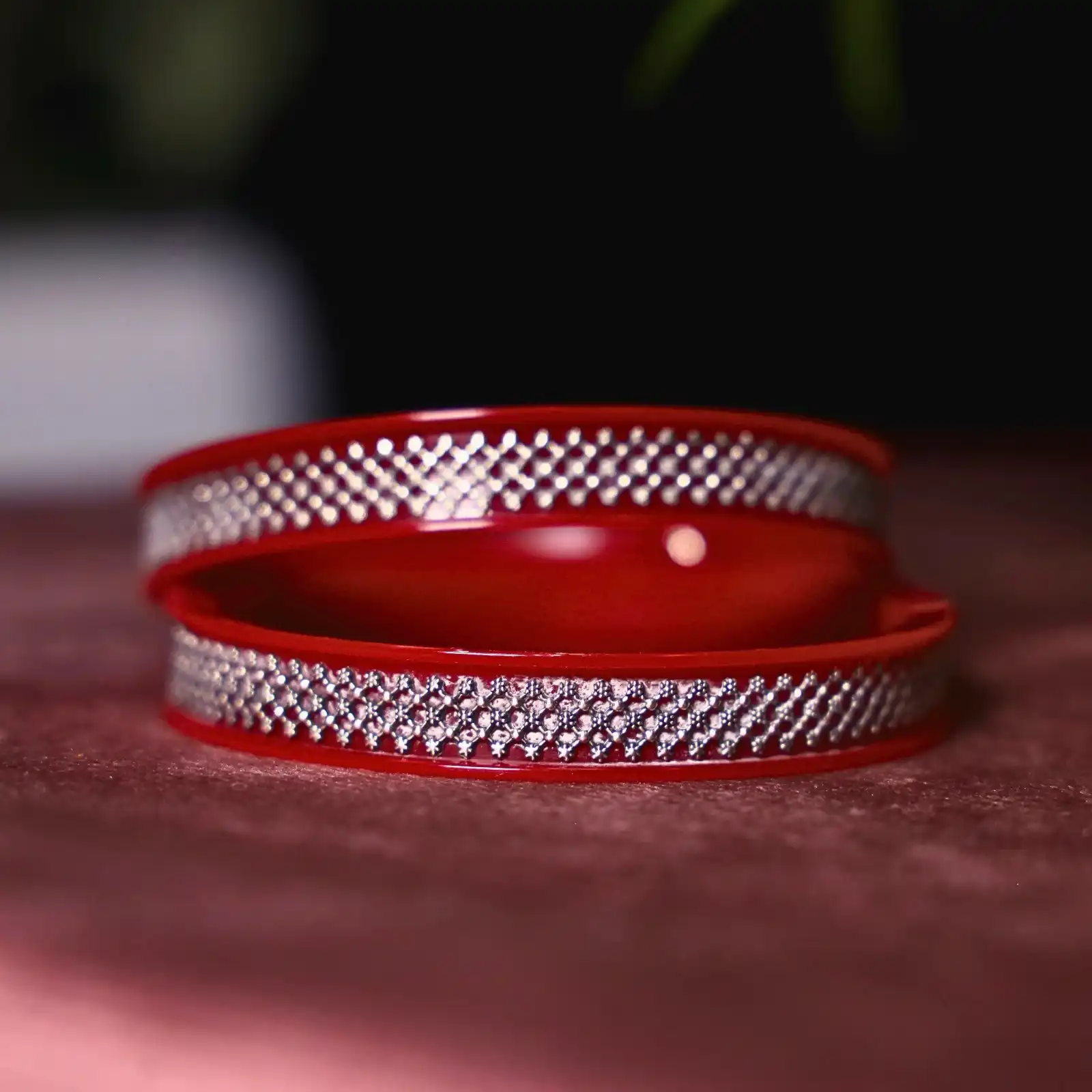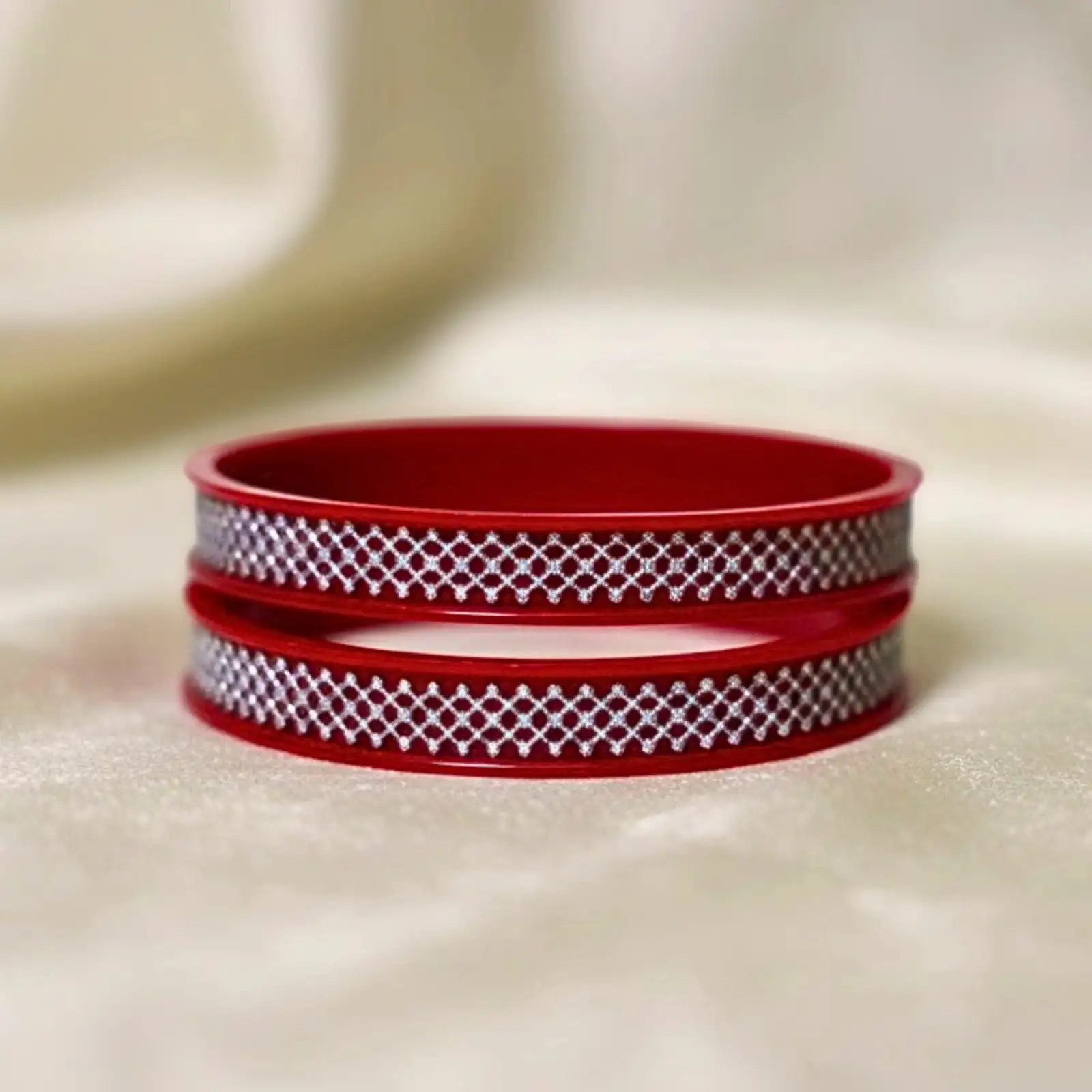 This classic red pola set features an intricate silver geometric pattern that adds a refined touch to its traditional charm. The vibrant red paired with the detailed silver work makes it ideal for pairing with silk sarees, Banarasi drapes, festive lehengas, or even a simple red-and-gold salwar suit for an elegant, culturally rooted look.