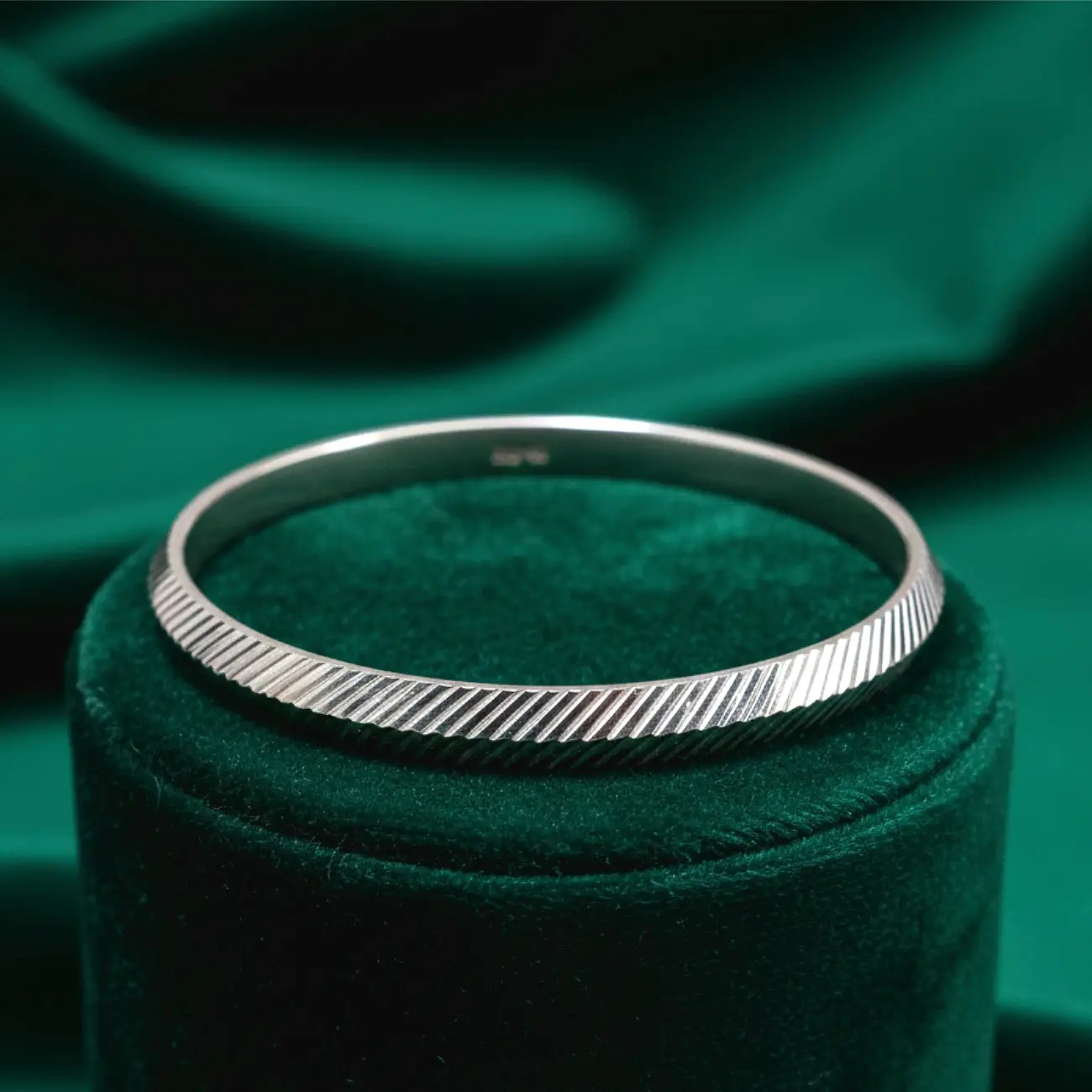 Jewellery Type: Bangle Metal: 925 Sterling Silve Size: 2.6 Occasion: Daily wear, Office, Festive gatherings, Gifting Style: Minimal, Contemporary Key Features: Crafted in premium 925 sterling silver Unique diagonal textured pattern for a refined modern look Smooth inner finish for all-day comfort Durable, tarnish-resistant polish Sleek slim profile — perfect for stacking or solo styling Care Instructions: Store in a dry, airtight jewellery box Avoid contact with perfumes, moisture and harsh chemicals Clean gently with a soft silver polishing cloth Remove before swimming or heavy physical activity