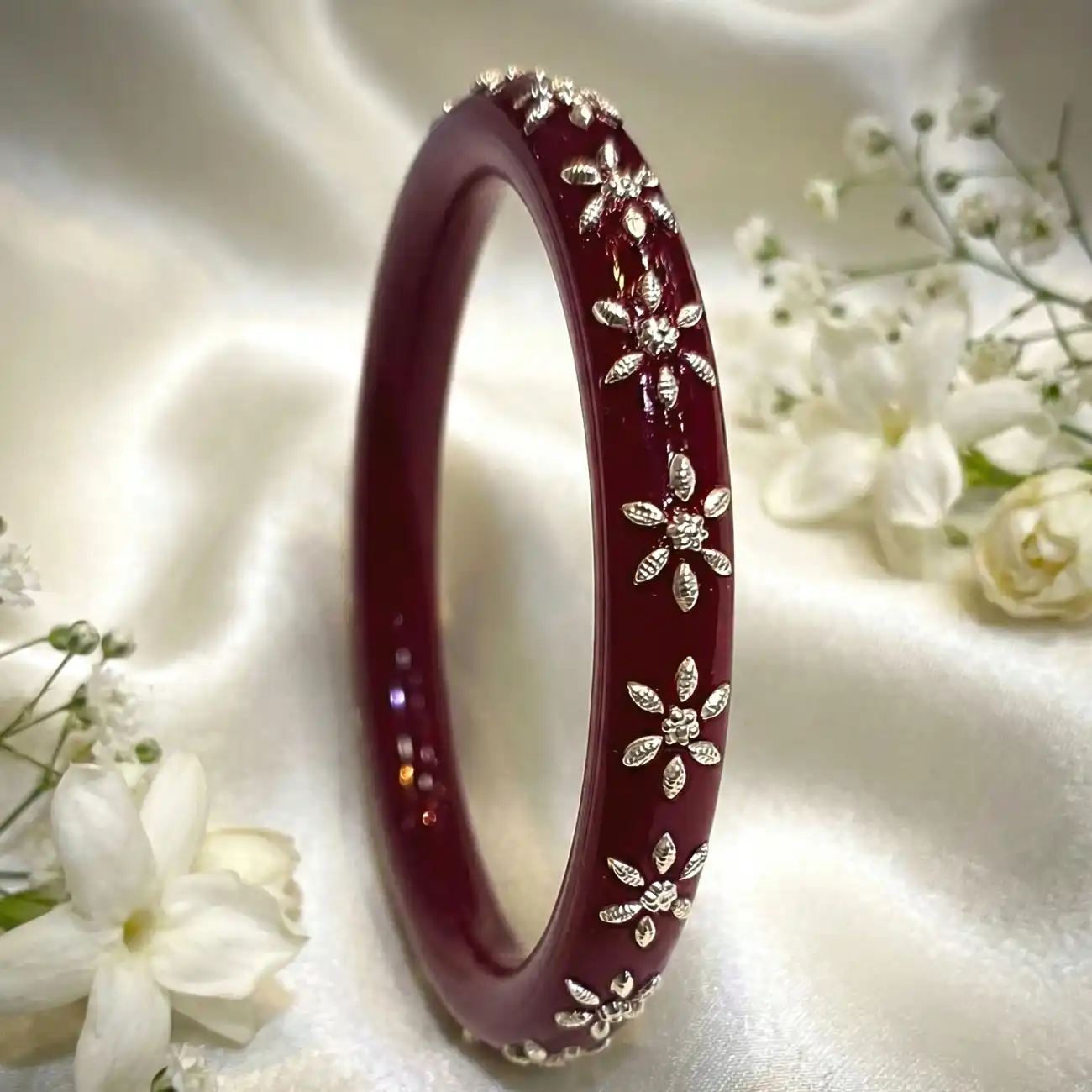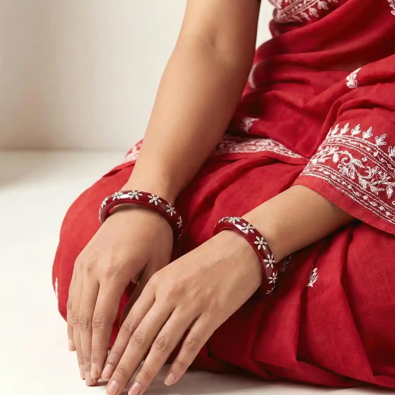 A graceful pair of deep ruby-red Pola bangles adorned with delicate silver floral motifs. The rich translucent red base adds warmth and depth, while the fine silver detailing brings a soft festive charm. Elegant and feminine, these bangles strike a beautiful balance between tradition and everyday sophistication. Dress pairing: • Red or ivory cotton sarees, hand-embroidered kurtas, festive kurta sets • Anarkalis, silk or chanderi suits for celebrations and pujas • Indo-western outfits like long dresses, ethnic co-ords, or solid-toned tunics • Complements warm tones, reds, maroons, creams, and gold accents for a refined finish