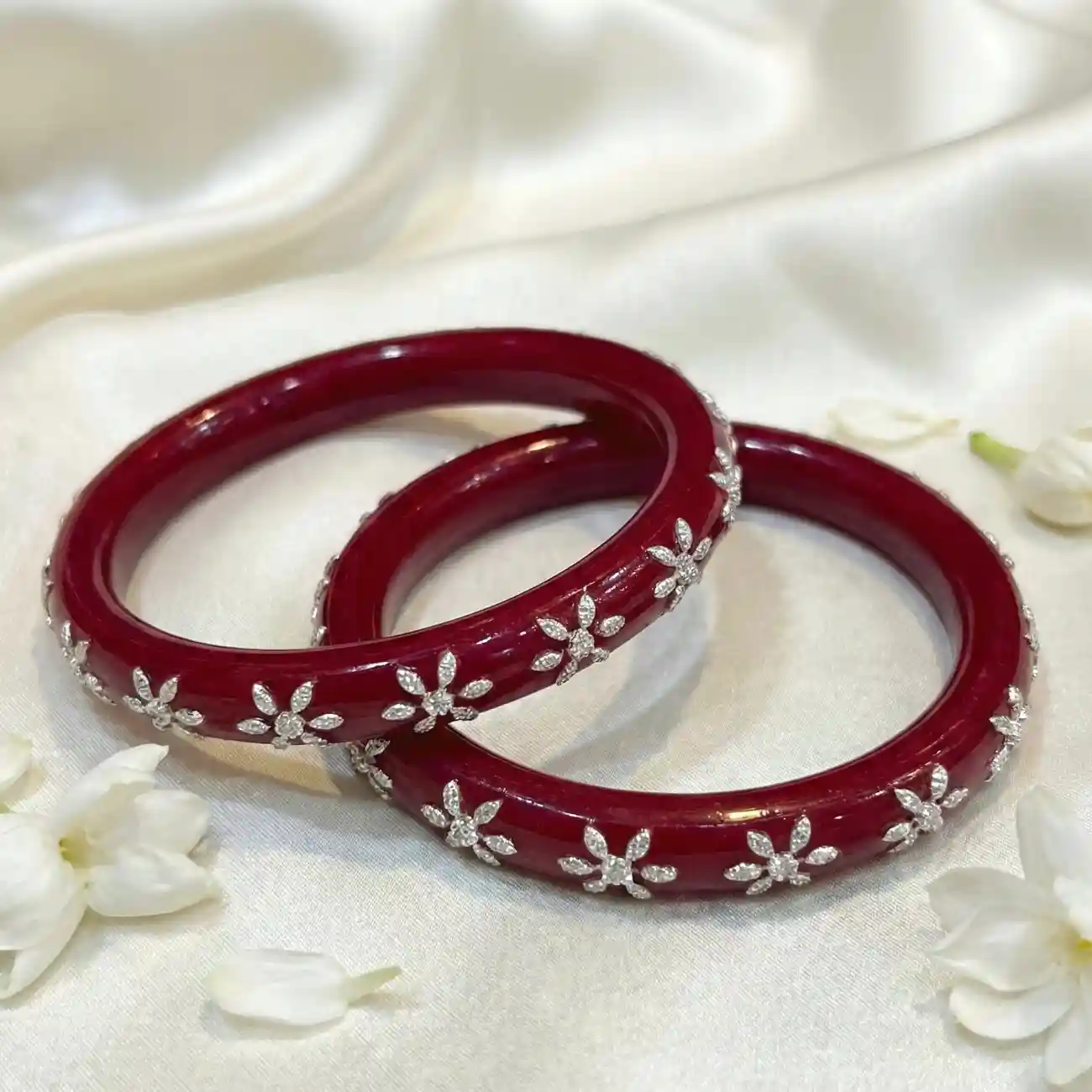 A graceful pair of deep ruby-red Pola bangles adorned with delicate silver floral motifs. The rich translucent red base adds warmth and depth, while t...