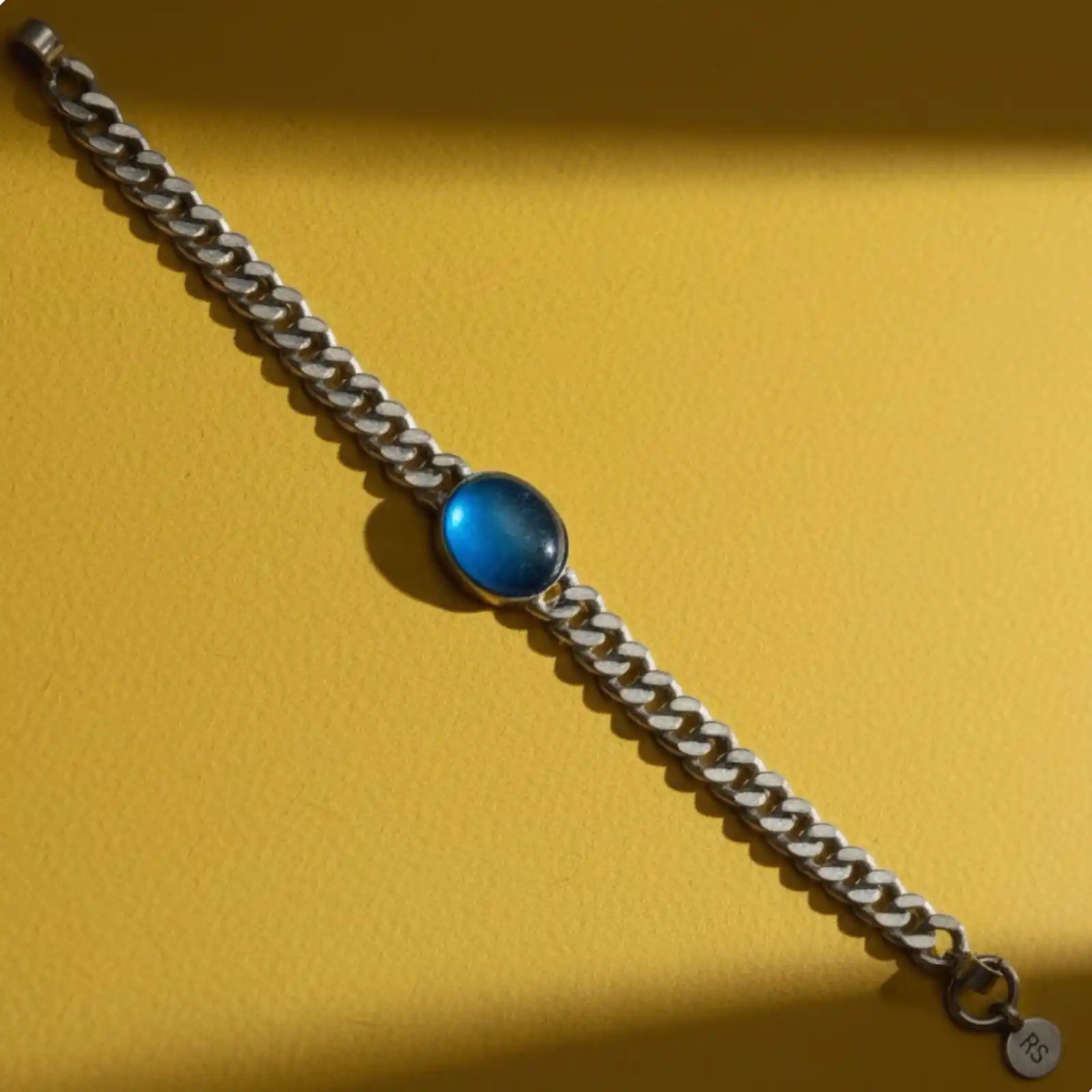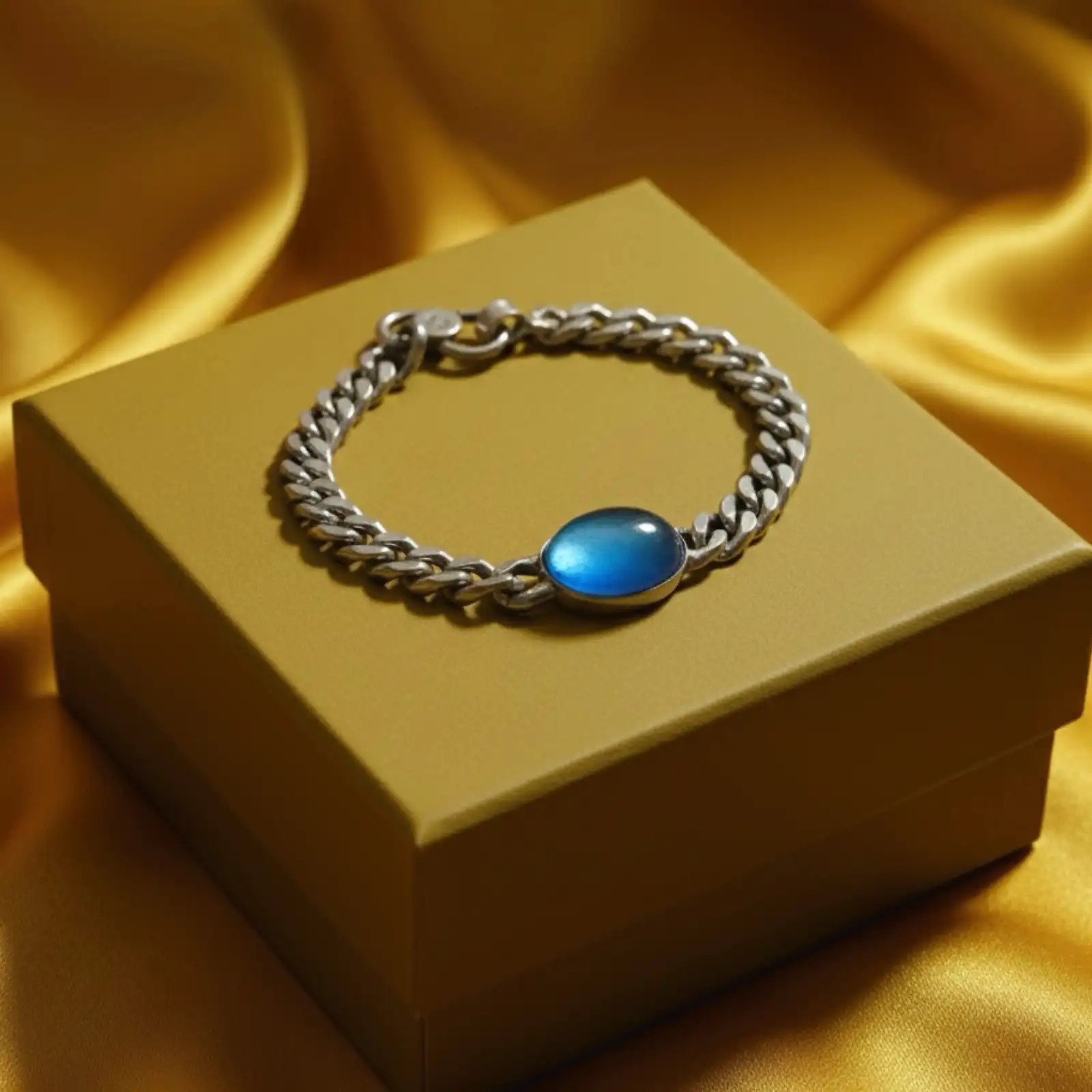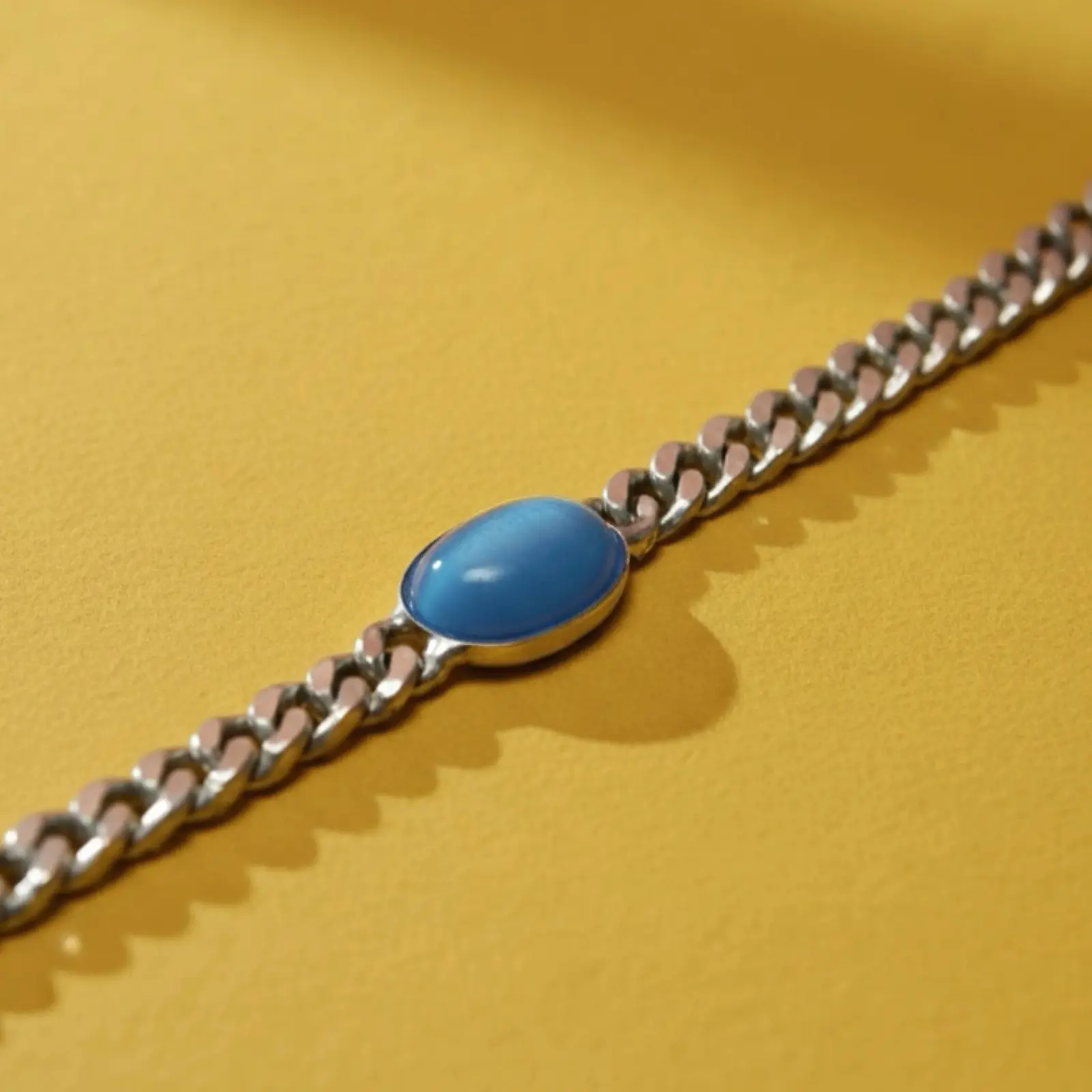 The Silver Chain Bracelet with Blue Stone by Mahanam Jewellers blends timeless craftsmanship with a touch of bold elegance. This bracelet features a sturdy silver curb chain centered with a smooth blue oval stone, symbolizing calmness and strength. Designed for the modern man who values both simplicity and distinction, it’s perfect for casual and formal wear alike. Highlights: • Sturdy silver curb chain with a polished finish • Striking blue oval stone centerpiece • Handcrafted for comfort and durability • Elegant yet masculine design for daily wear • Made by Mahanam Jewellers with attention to detail