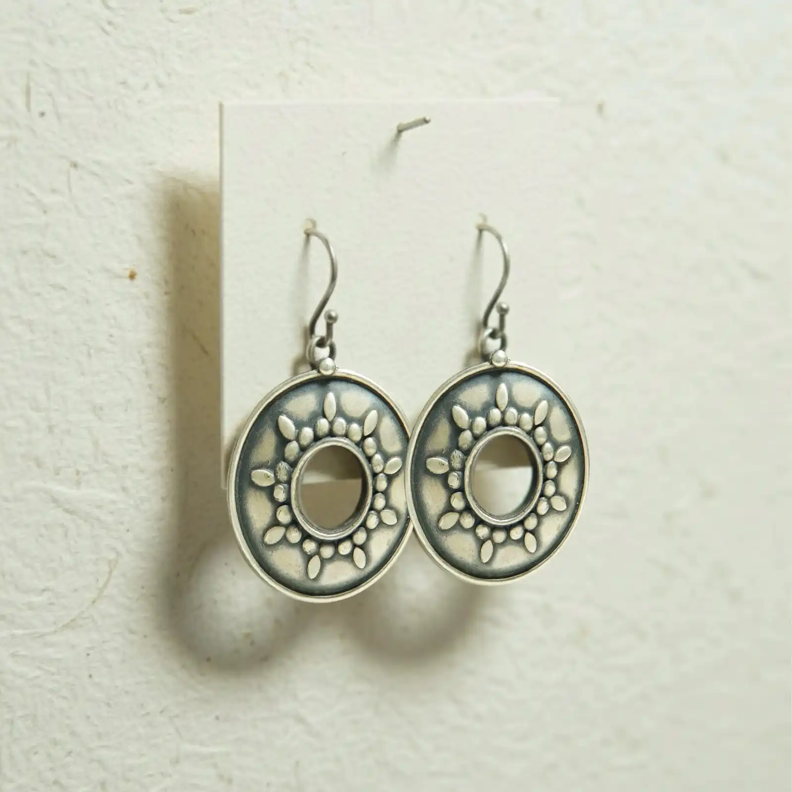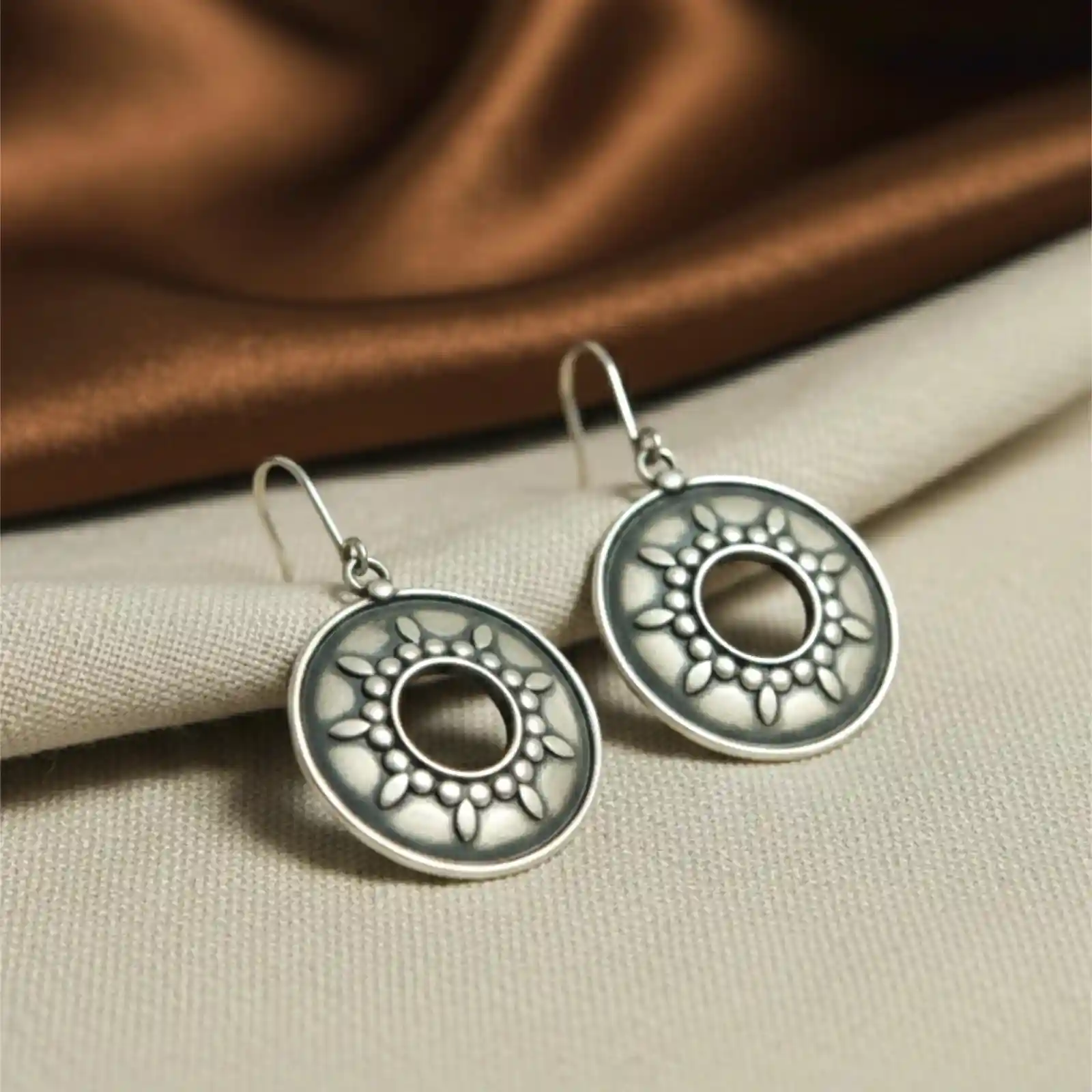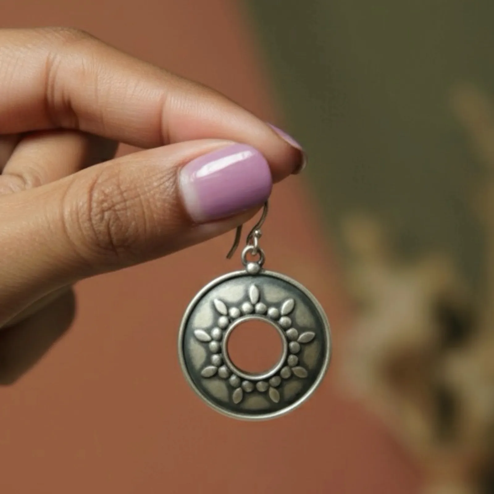 These antique-finish silver drop earrings feature a timeless circular design adorned with a raised floral motif. The oxidised detailing adds depth and...