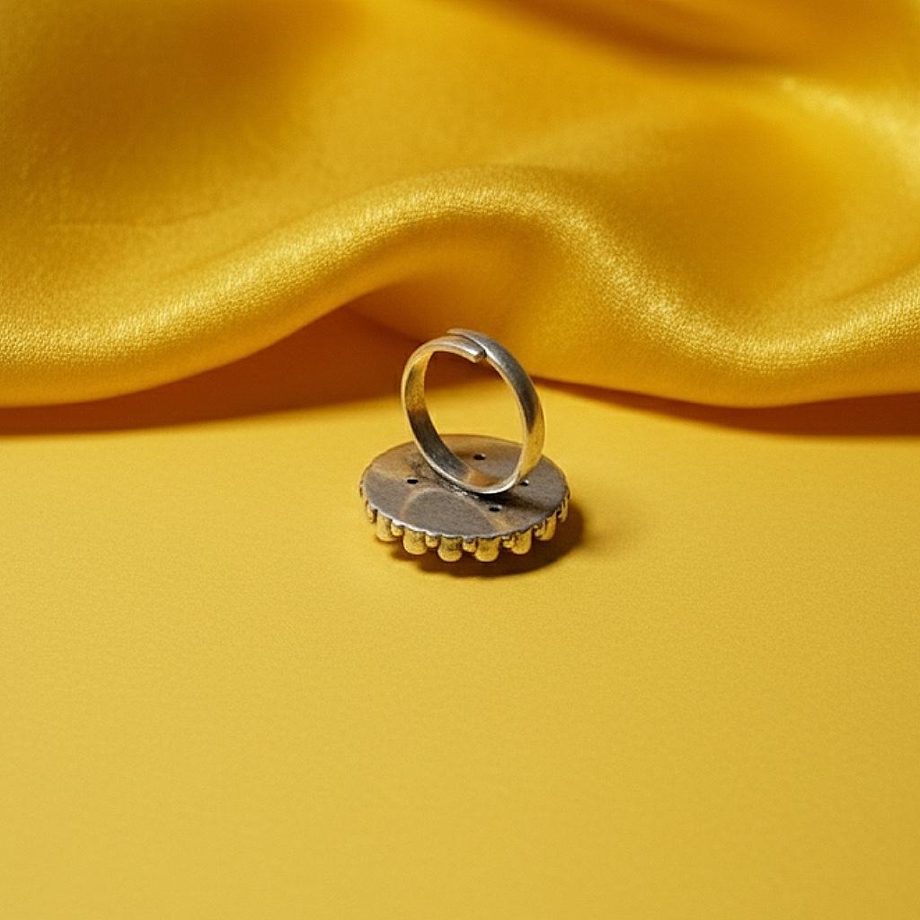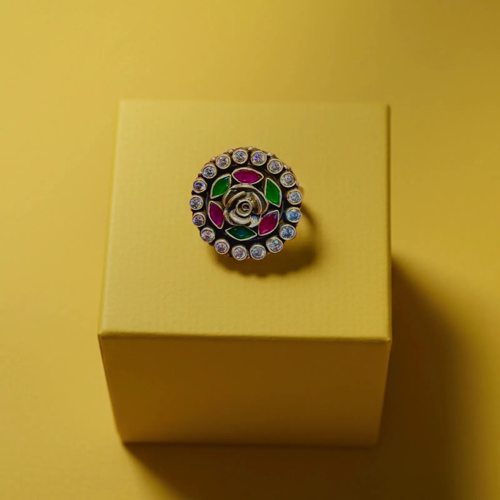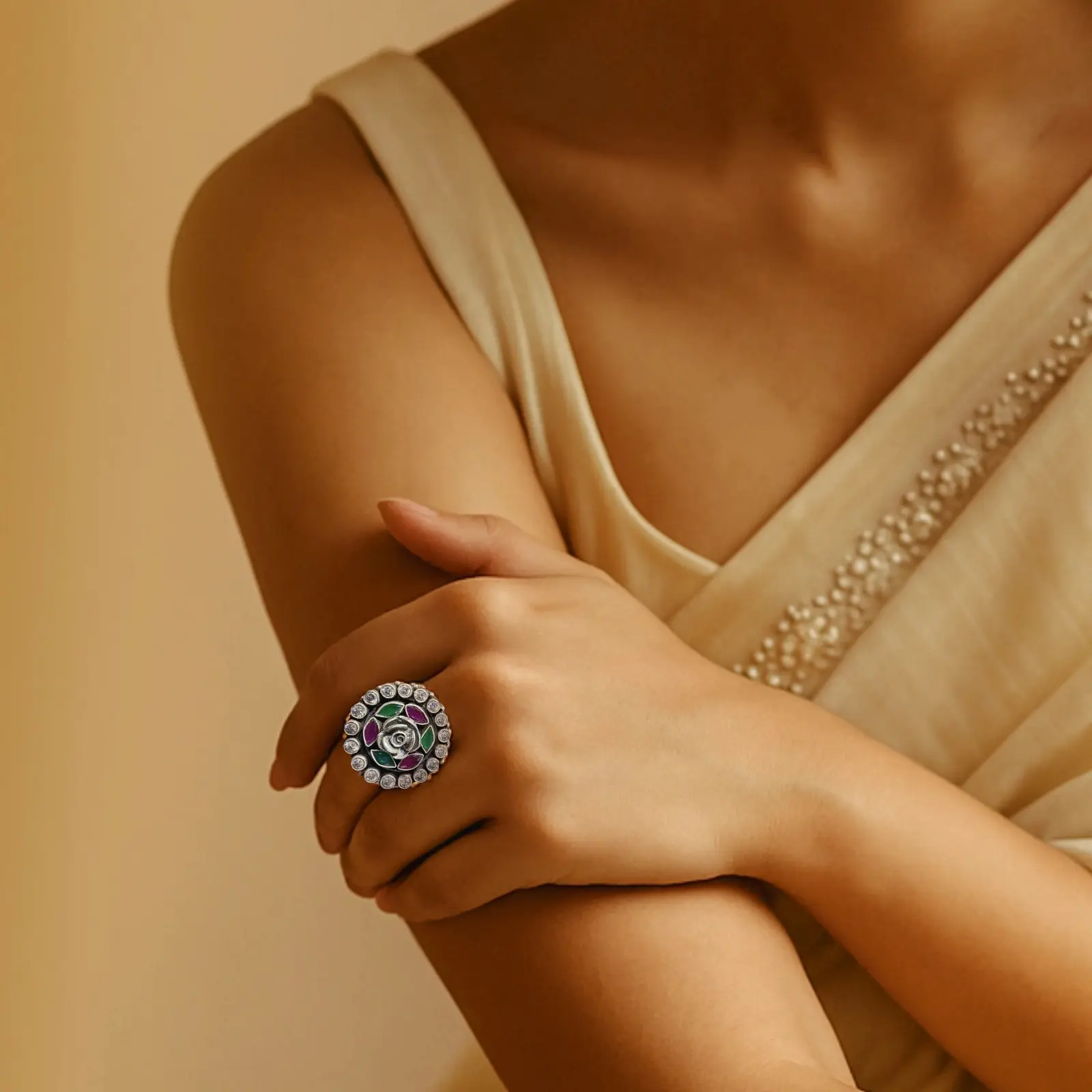 Add a touch of artistry to your style with this handcrafted silver ring featuring a vibrant enamel rose motif in red and green hues. Surrounded by a halo of sparkling stones, the design blends traditional charm with modern elegance. Perfect for festive celebrations or casual outings, this piece brings a refreshing pop of colour to your jewellery collection. Highlights * Crafted in pure silver * Hand-painted enamel rose motif in red and green * Crystal-studded circular border * Lightweight and comfortable for daily wear * Pairs beautifully with ethnic and Indo-western outfits