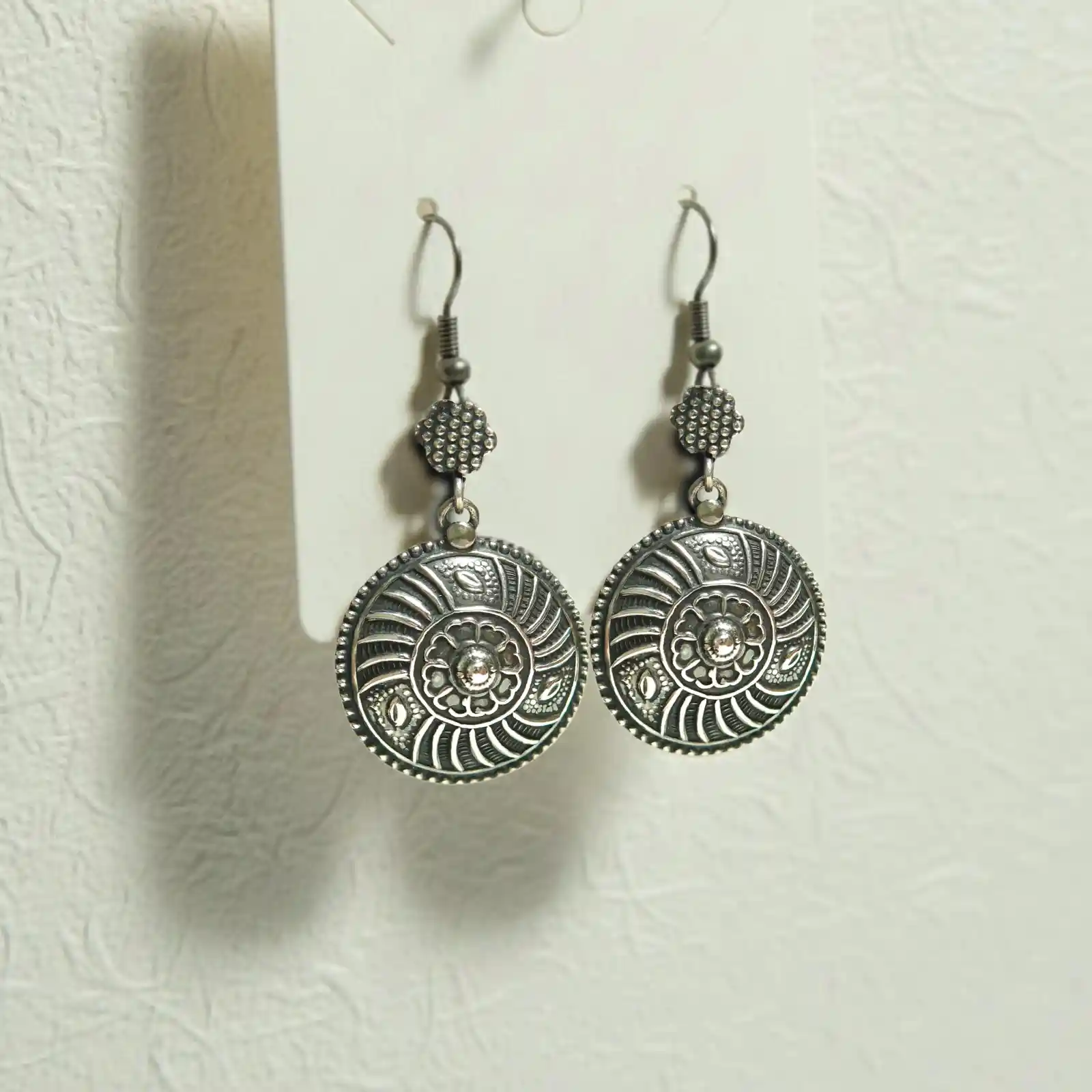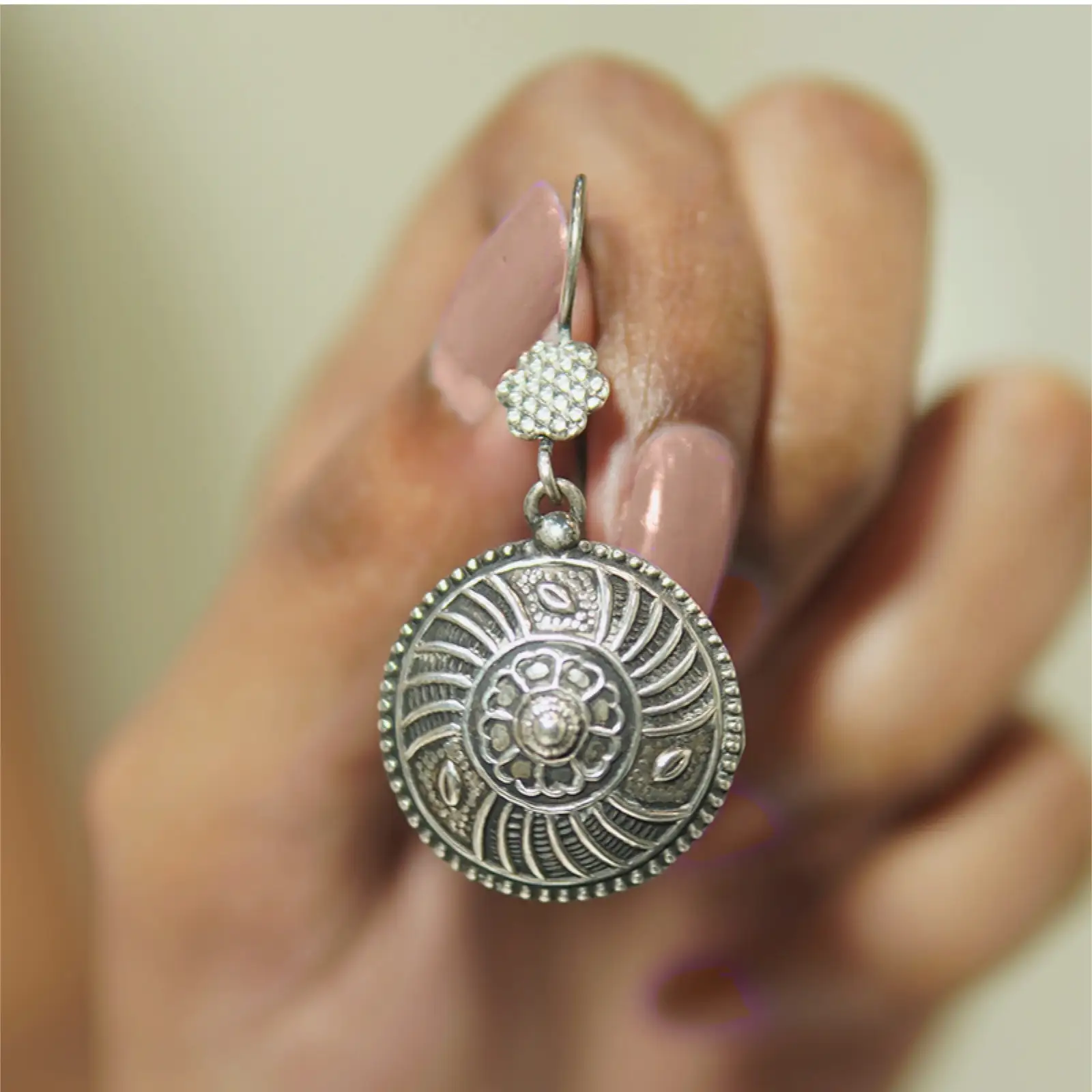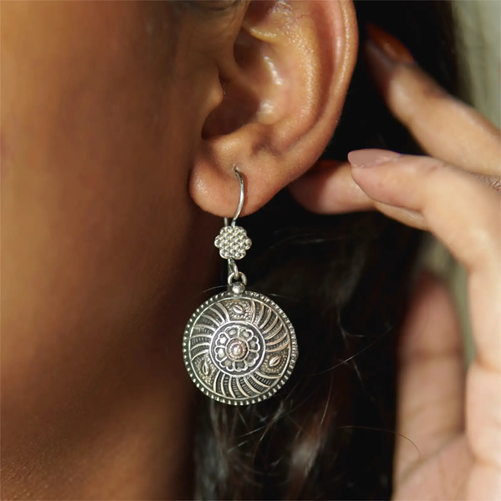 These elegant silver drop earrings feature a beautifully engraved circular motif with a detailed floral centre and graceful spiral accents. Lightweight and artistic, they add a refined traditional touch to both ethnic and Indo-western outfits.