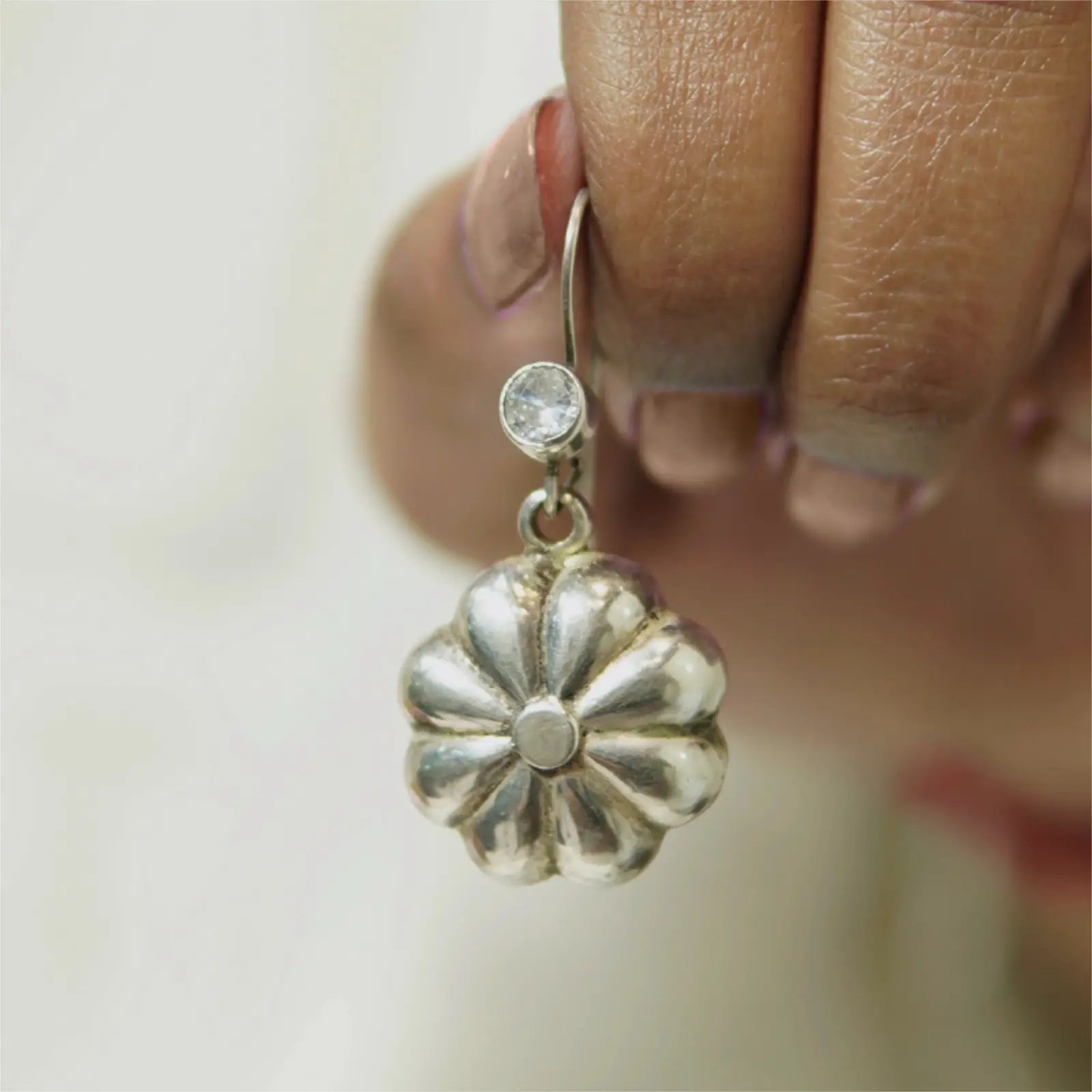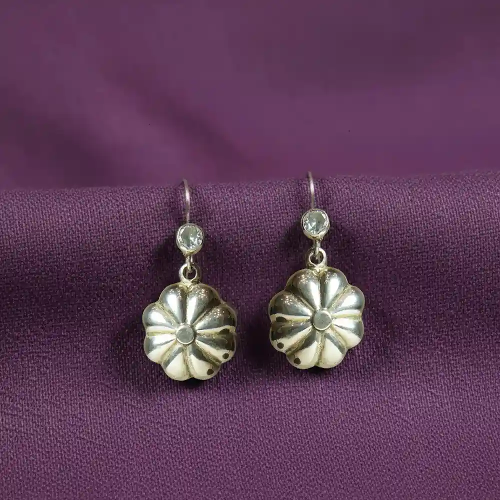 These earrings feature softly sculpted flower-shaped charms that hang from a delicate hook, each topped with a clear, round accent that adds a gentle touch of sparkle. The smooth metallic finish highlights the curved petal detailing, creating a look that is understated yet elegant. Lightweight and versatile, they bring a graceful floral touch to both everyday wear and special occasions. Dress-Pairing Suggestions: • Pair with a simple cotton kurta or linen dress for an easy, polished daytime look. • Style with a pastel saree or chiffon dupatta for a refined, feminine ensemble. • Wear with a black dress or jumpsuit to let the subtle shimmer stand out during evenings. • Perfect complement to floral prints, soft solids, and minimal monochrome outfits.