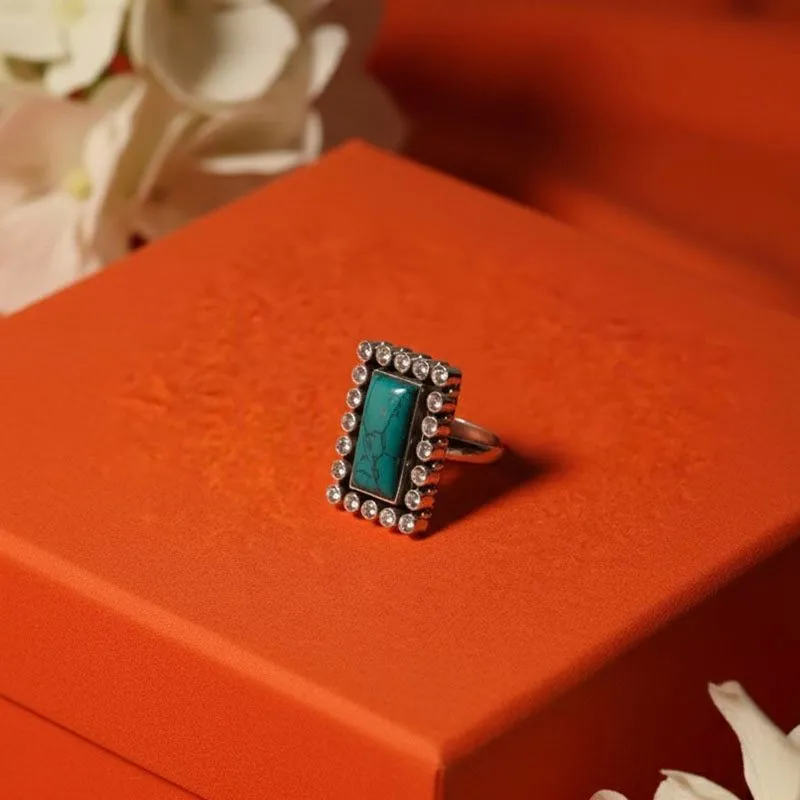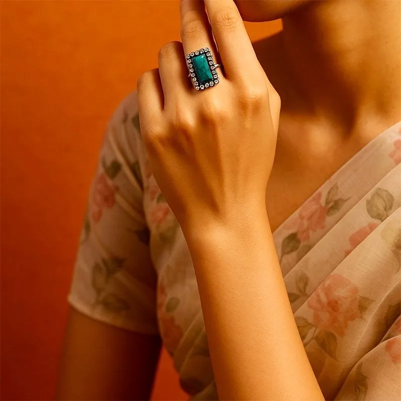 This elegant ring features a rectangular emerald stone bordered with sparkling white stones, set in pure silver. Its simple yet classy design pairs beautifully with both ethnic and modern outfits. Perfect for festive occasions or everyday style. Highlights: Crafted in pure silver Rectangular emerald stone with crystal border Lightweight and comfortable for all-day wear Suitable for festive, party, or casual looks