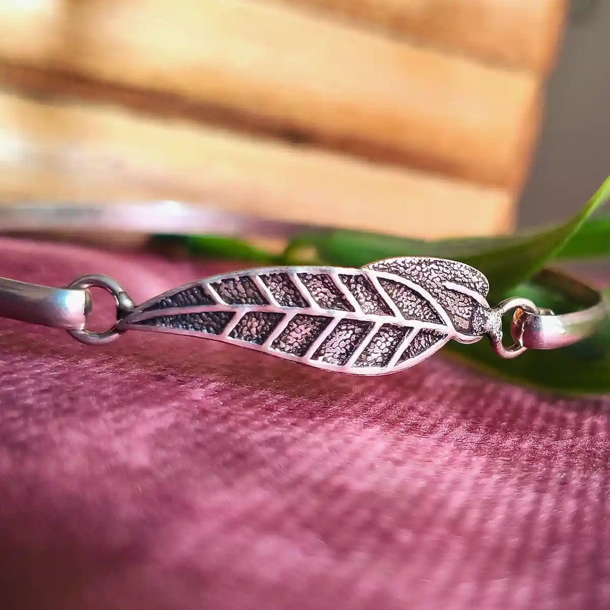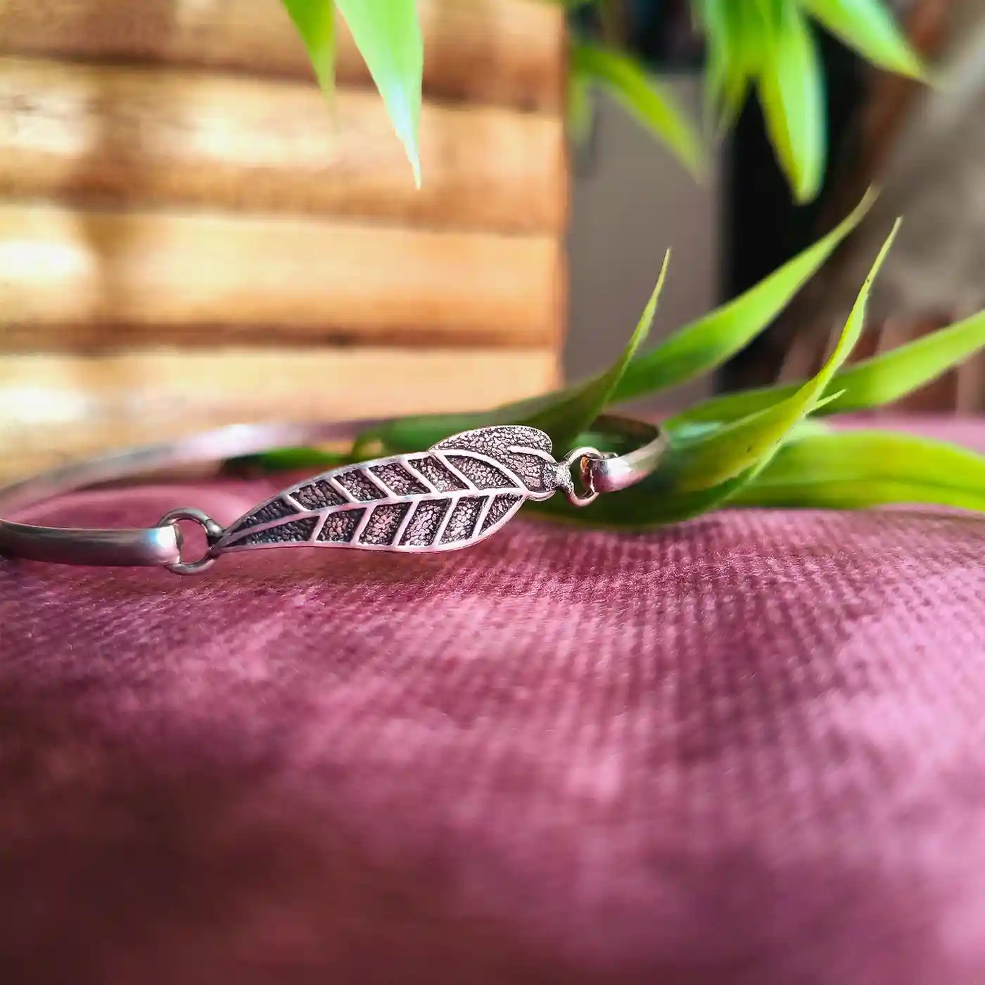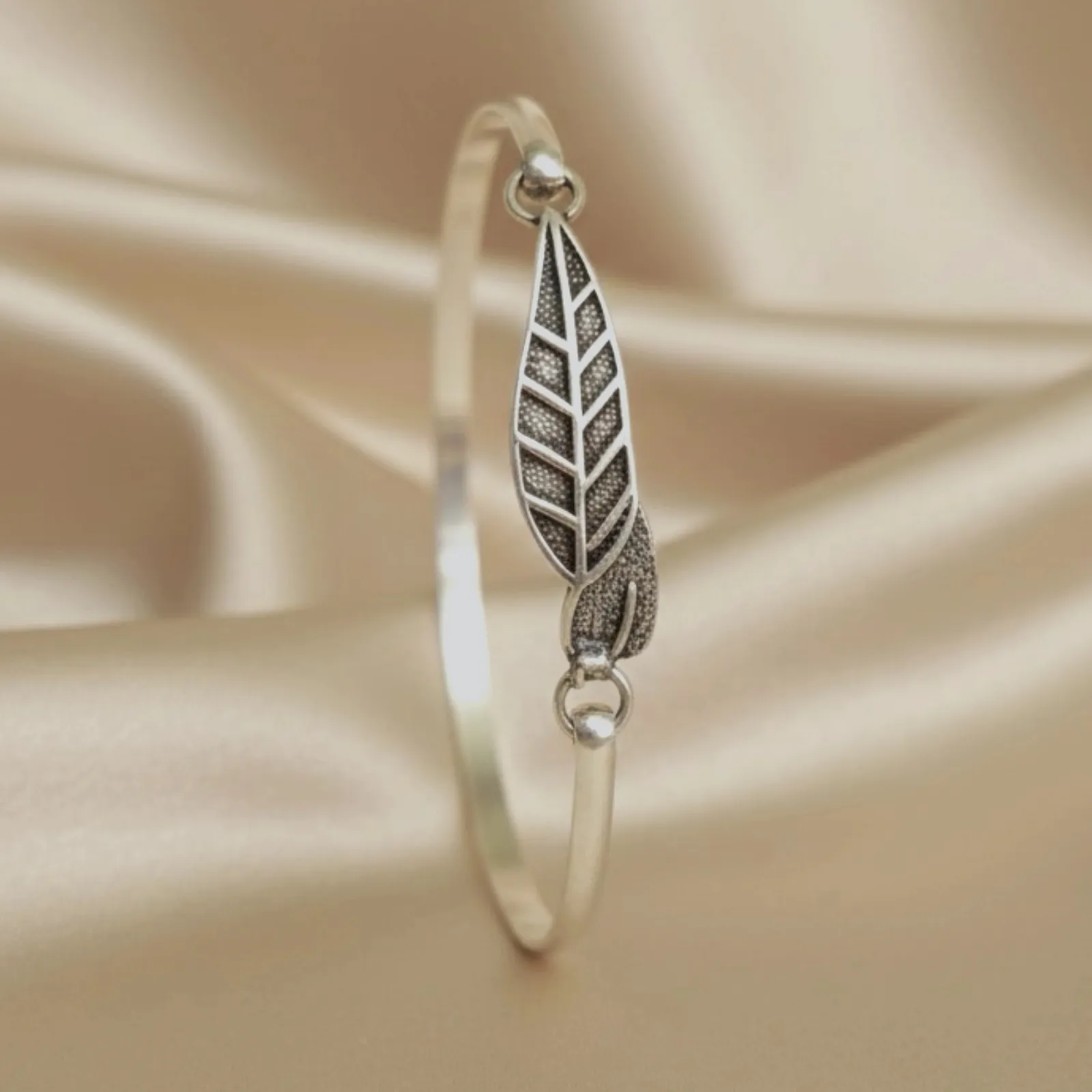 This delicate bracelet features a sleek band paired with a finely crafted leaf charm, giving it a soft, nature-inspired elegance. The subtle texture on the leaf adds depth while maintaining a clean and minimal look—perfect for both everyday use and casual outings. It pairs beautifully with flowy kurtis, pastel sarees, and even Western wear like tops, shirts, and dresses for a refined, effortless touch