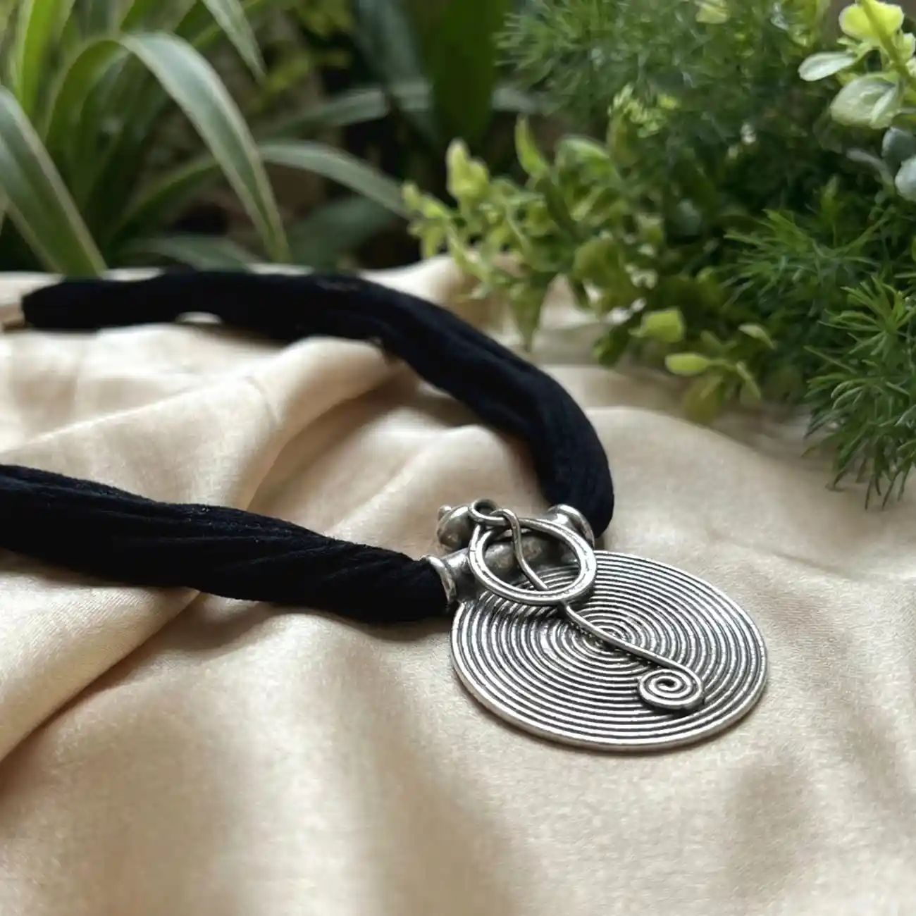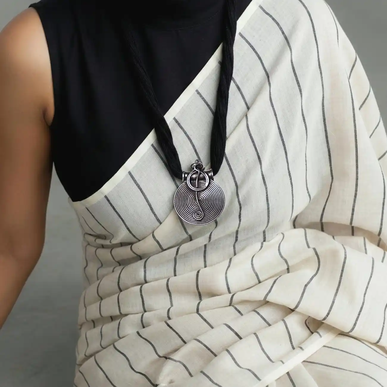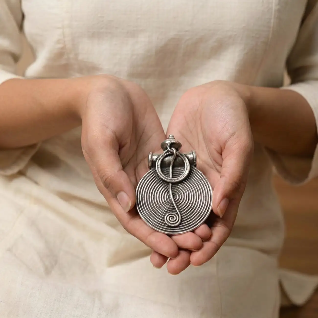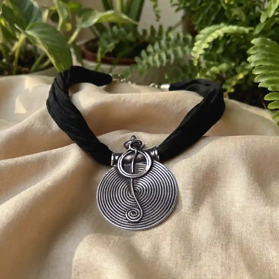 A bold circular silver pendant featuring concentric spiral detailing that draws the eye inward, finished with a distinctive handcrafted bail and central linear accent. The rhythmic coil pattern symbolises continuity and balance, giving the piece a strong tribal character rooted in indigenous craftsmanship. Statement-making yet refined, this pendant is designed to stand out while remaining deeply wearable. Dress pairing: • Handloom sarees in solid or striped patterns—black, red, indigo, or beige • High-neck blouses, sleeveless kurtas, and minimal ethnic silhouettes • Indo-western outfits and monochrome looks where the pendant becomes the focal point