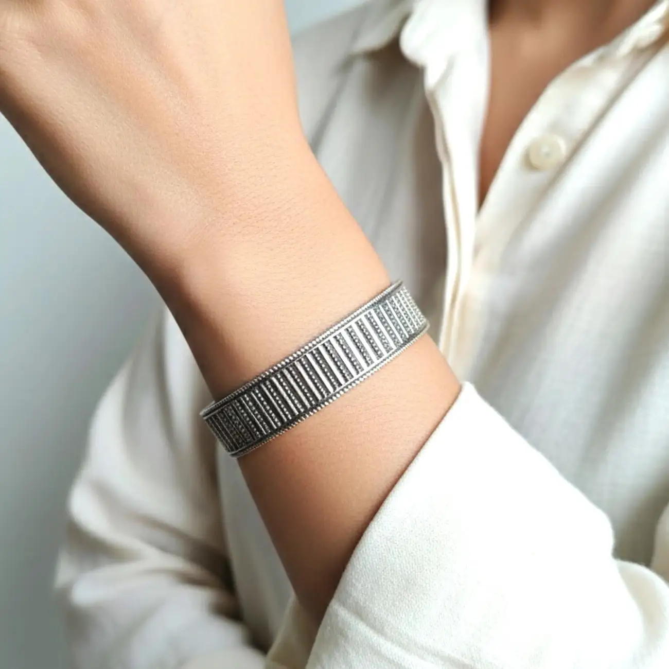 A sleek silver cuff featuring a modern vertical-line pattern accentuated with tiny beaded detailing. The contrast of dark grooves and raised silver beads creates a bold textured look while maintaining a clean, contemporary aesthetic. Lightweight, sturdy, and versatile, this cuff transitions effortlessly from everyday wear to festive styling. Dress pairing: • Minimalist outfits—solid shirts, linen tops, neutral-toned dresses • Traditional wear like cotton kurtas, handloom sarees, and printed suit sets • Indo-western co-ords and flowy dresses for a chic fusion appeal • Casual Western looks, especially denims and monochrome ensembles