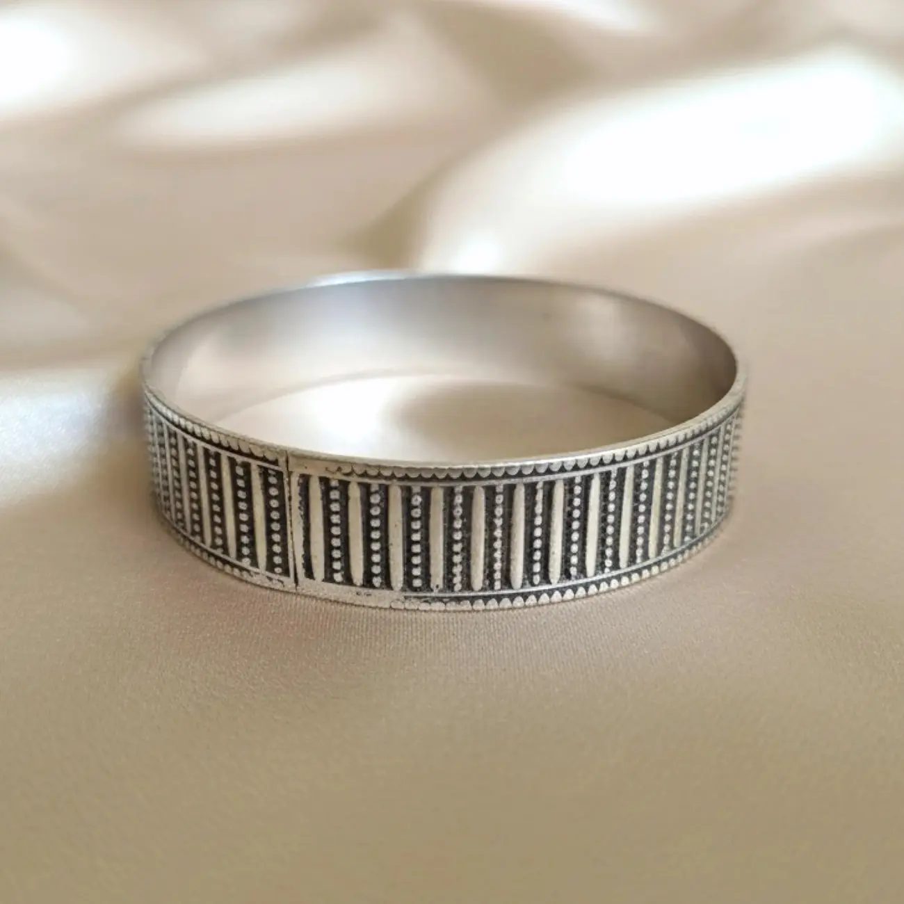 A sleek silver cuff featuring a modern vertical-line pattern accentuated with tiny beaded detailing. The contrast of dark grooves and raised silver be...