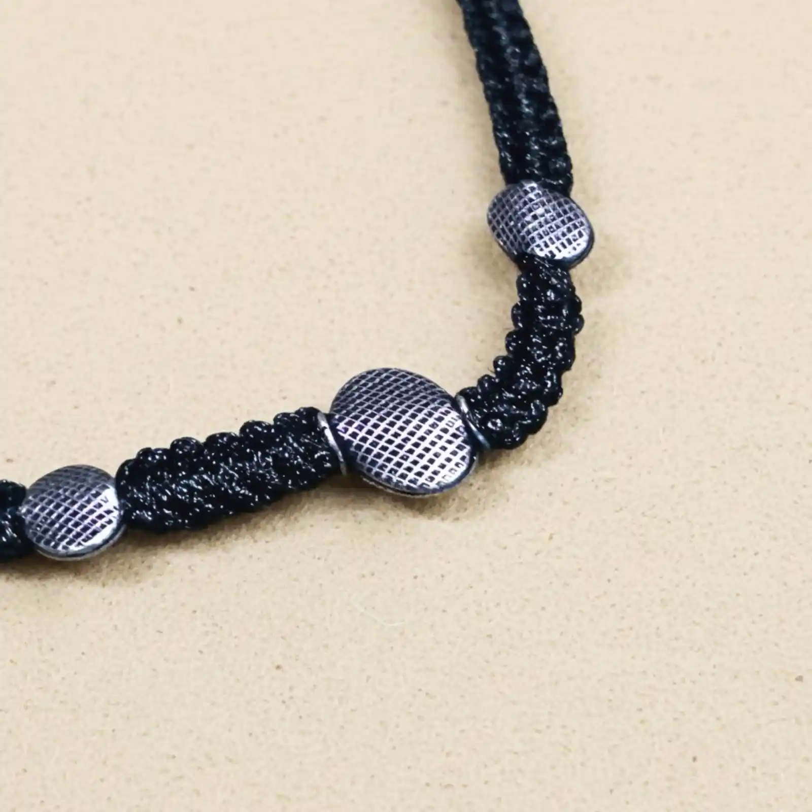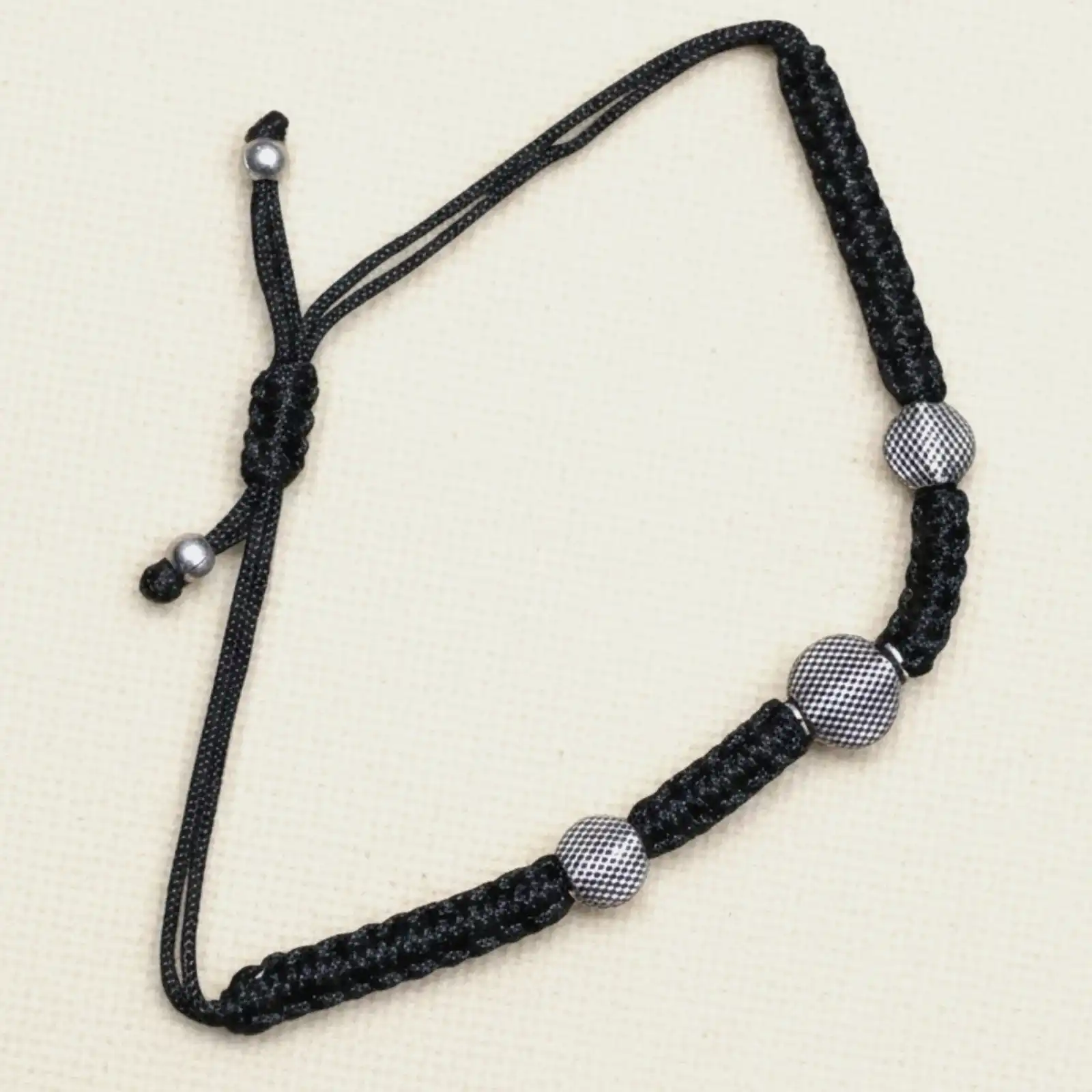 A sleek black-thread anklet featuring three textured silver-tone beads for a minimalist yet stylish look. The adjustable macramé knot ensures a comfo...