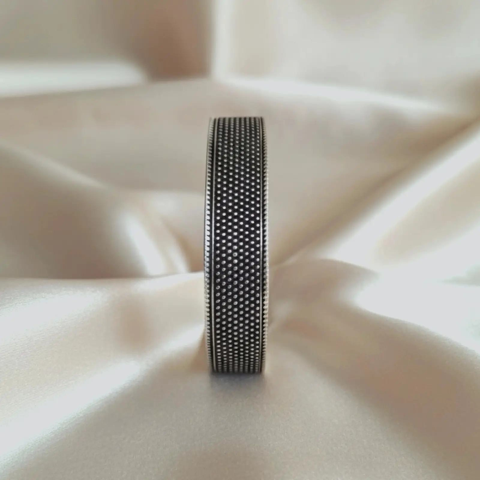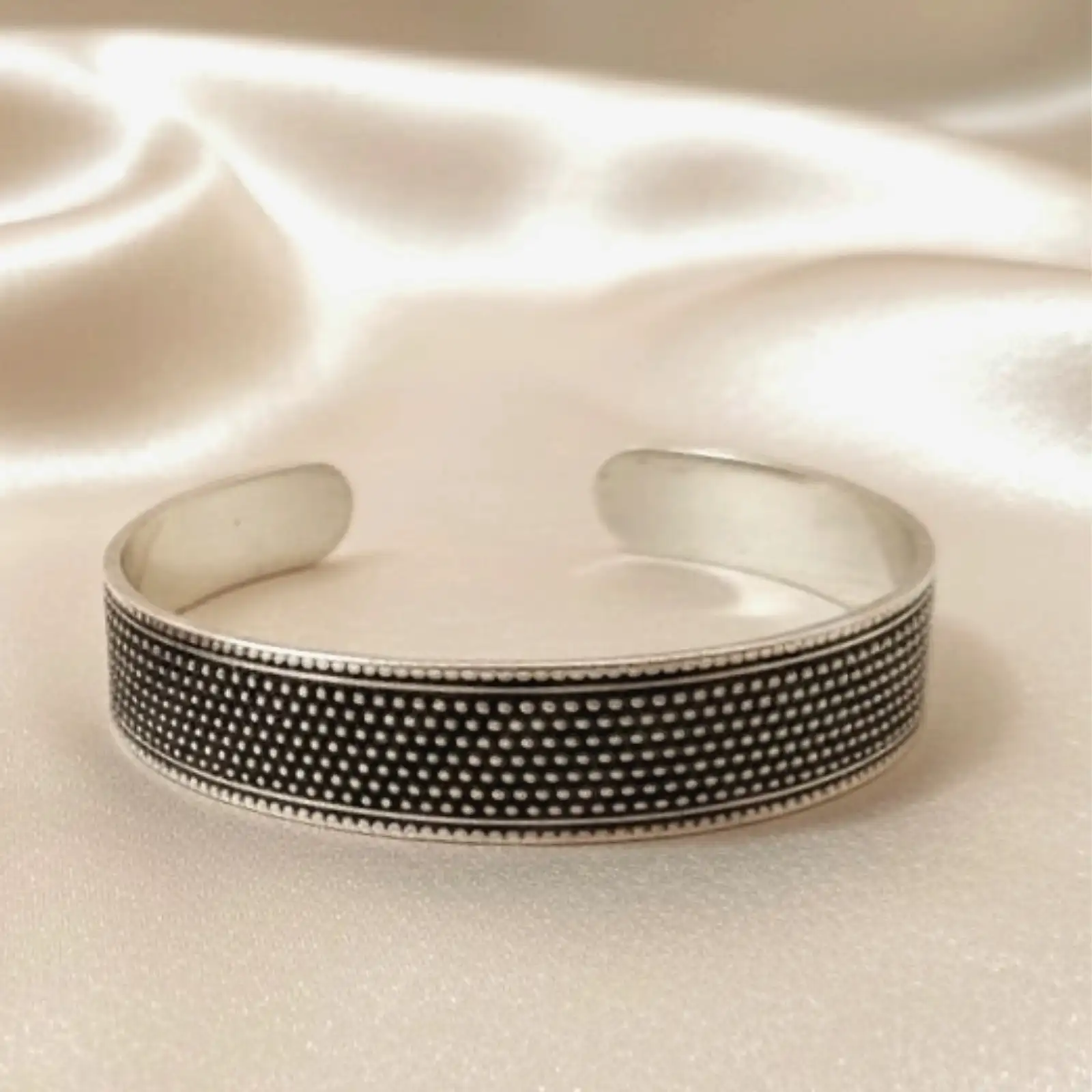 This sleek cuff-style bangle features a neat dotted texture across its surface, giving it a clean, modern, and versatile appeal. The smooth metallic f...