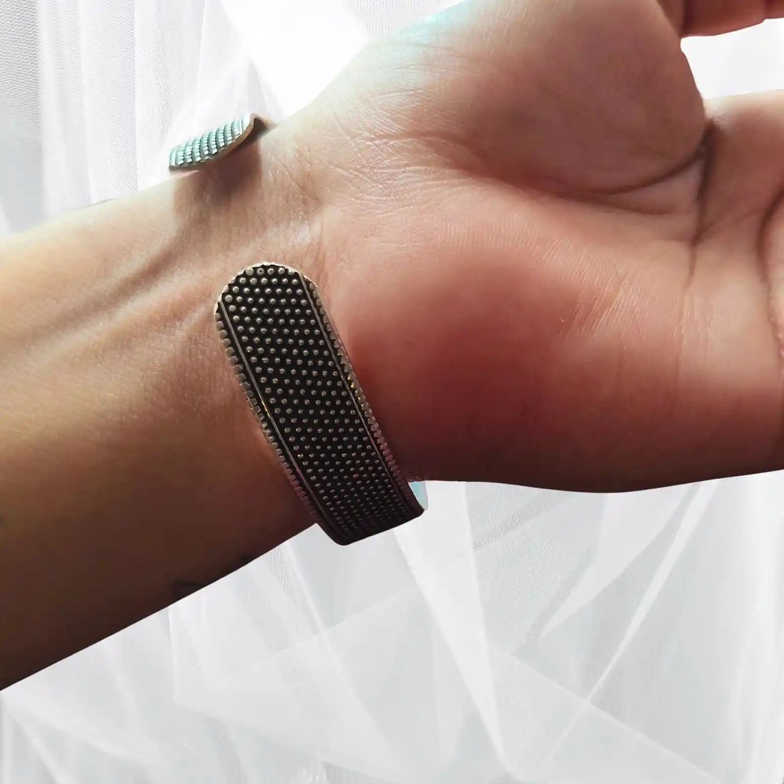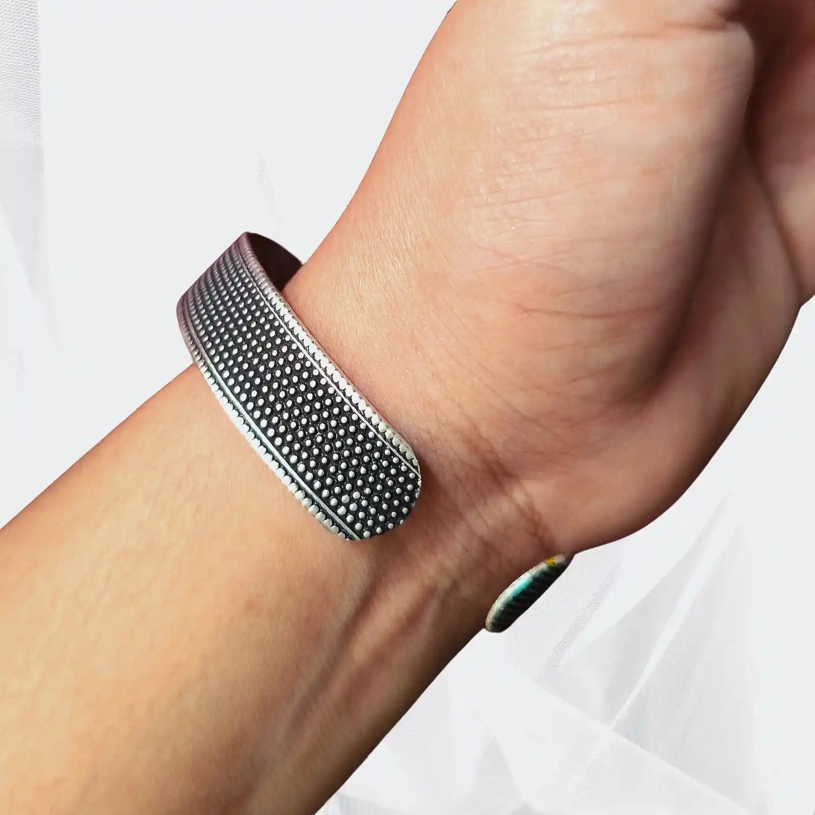 This sleek cuff-style bangle features a neat dotted texture across its surface, giving it a clean, modern, and versatile appeal. The smooth metallic finish and structured design make it suitable for both everyday wear and statement styling. It pairs beautifully with solid-colour sarees, contemporary kurtis, and even Western outfits like shirts or dresses—adding a subtle yet striking touch to any look