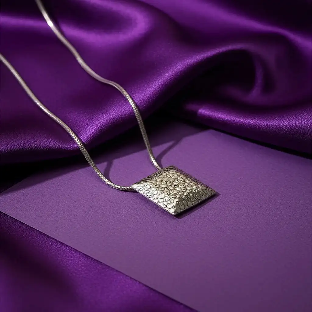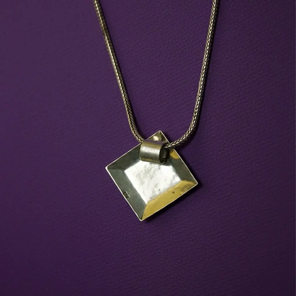 This elegant silver pendant features a handcrafted square design with a unique hammered texture that reflects artistry and sophistication. The minimalist geometry and subtle shine make it a versatile accessory that complements both formal and casual ensembles. A timeless piece that embodies the beauty of handcrafted silver craftsmanship. Highlights: • Made in pure silver • Hand-hammered square textured pendant • Sleek, modern design with a premium finish • Lightweight and durable for daily wear • Ideal for layering or solo statement styling