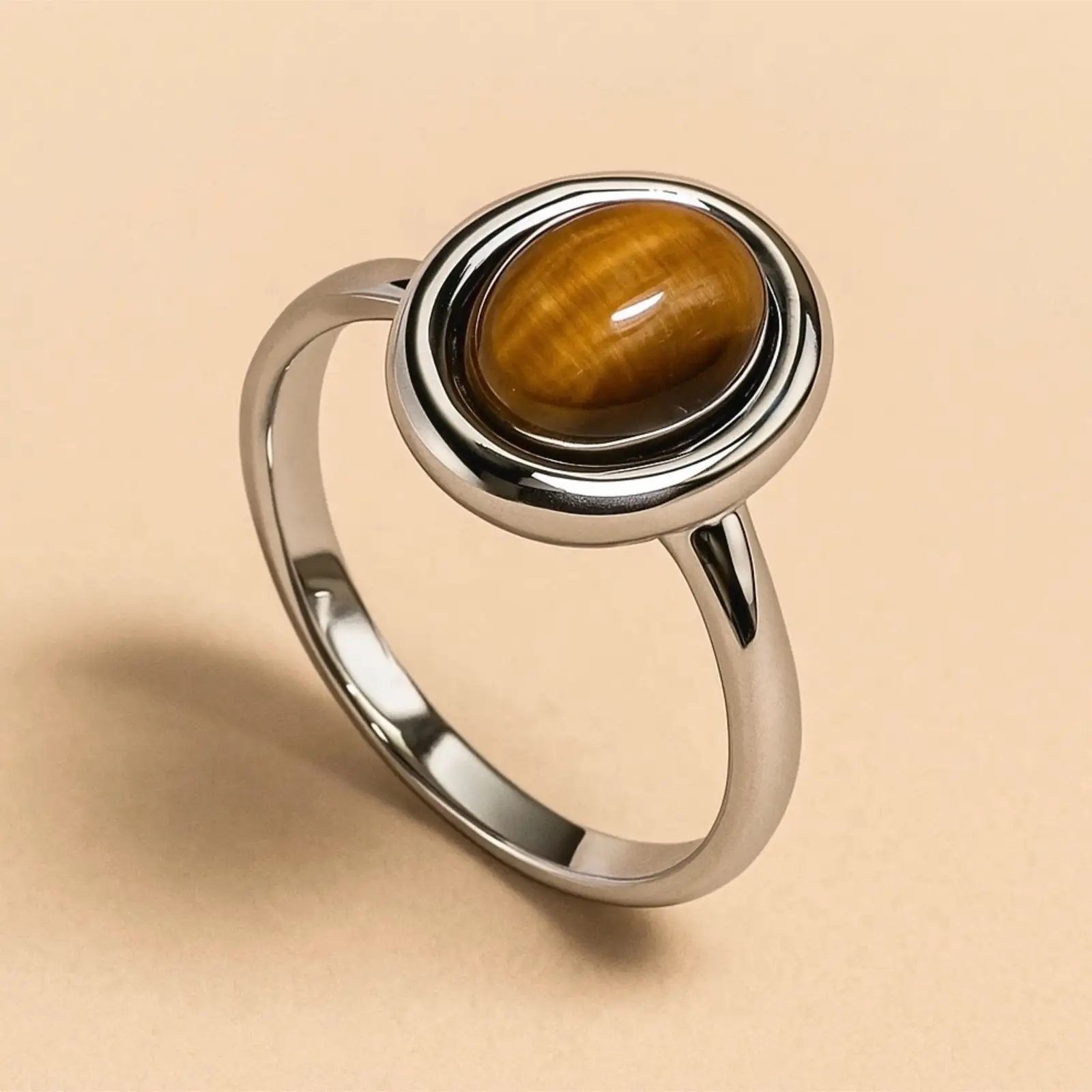 A sleek and elegant ring featuring a polished oval tiger eye stone set in a smooth silver-tone bezel. The warm golden-brown hues of the stone catch th...