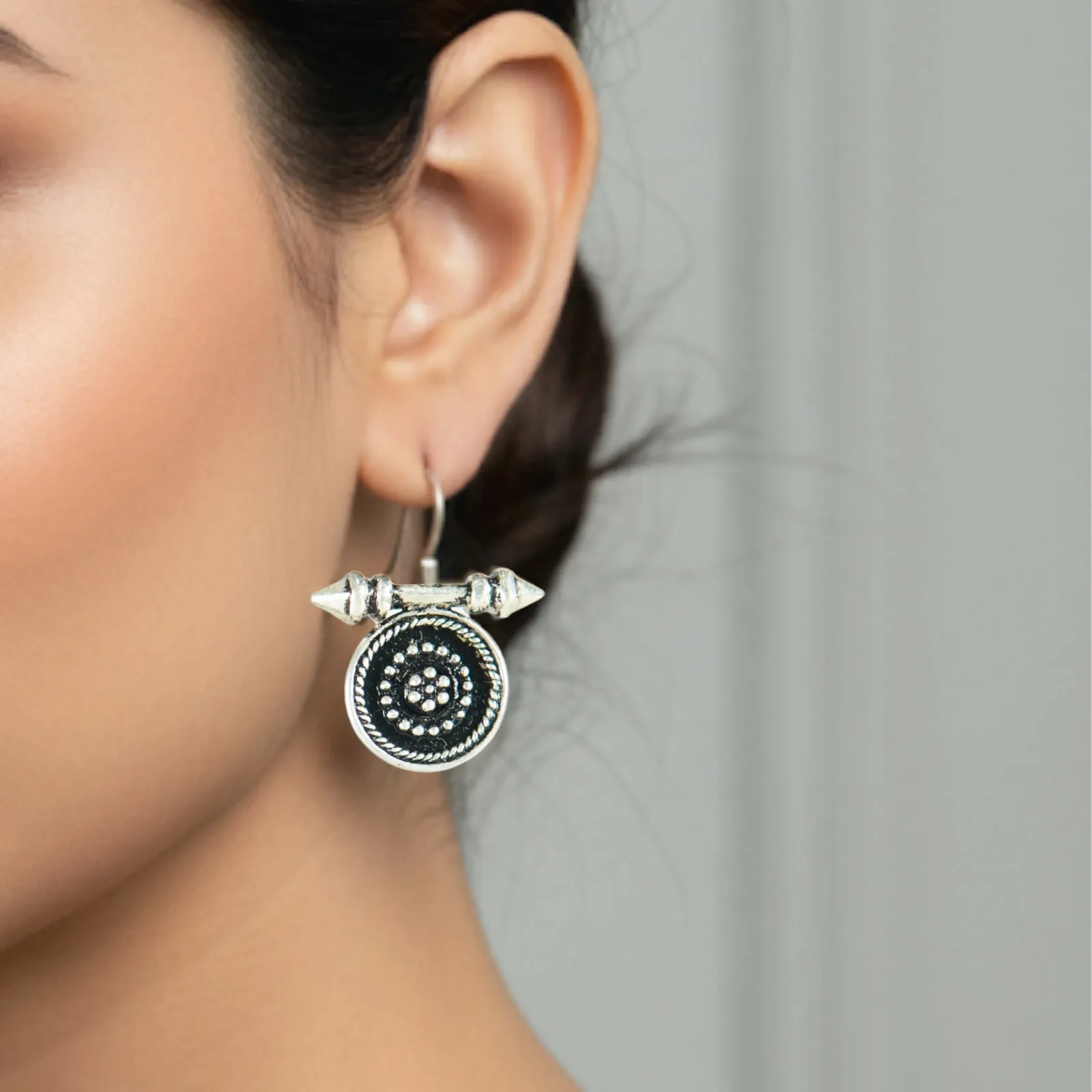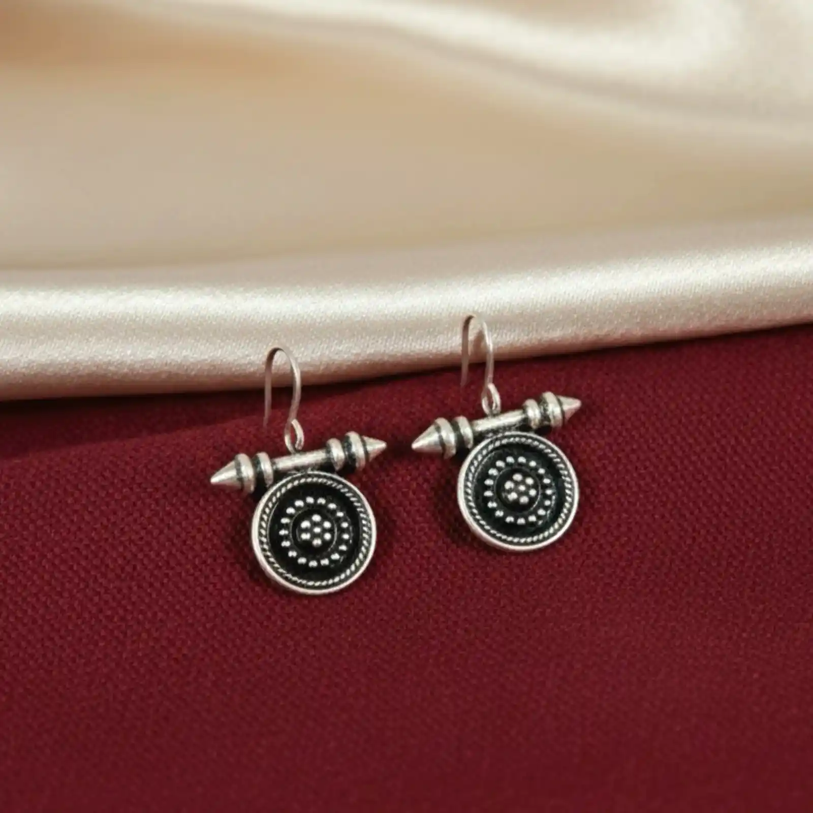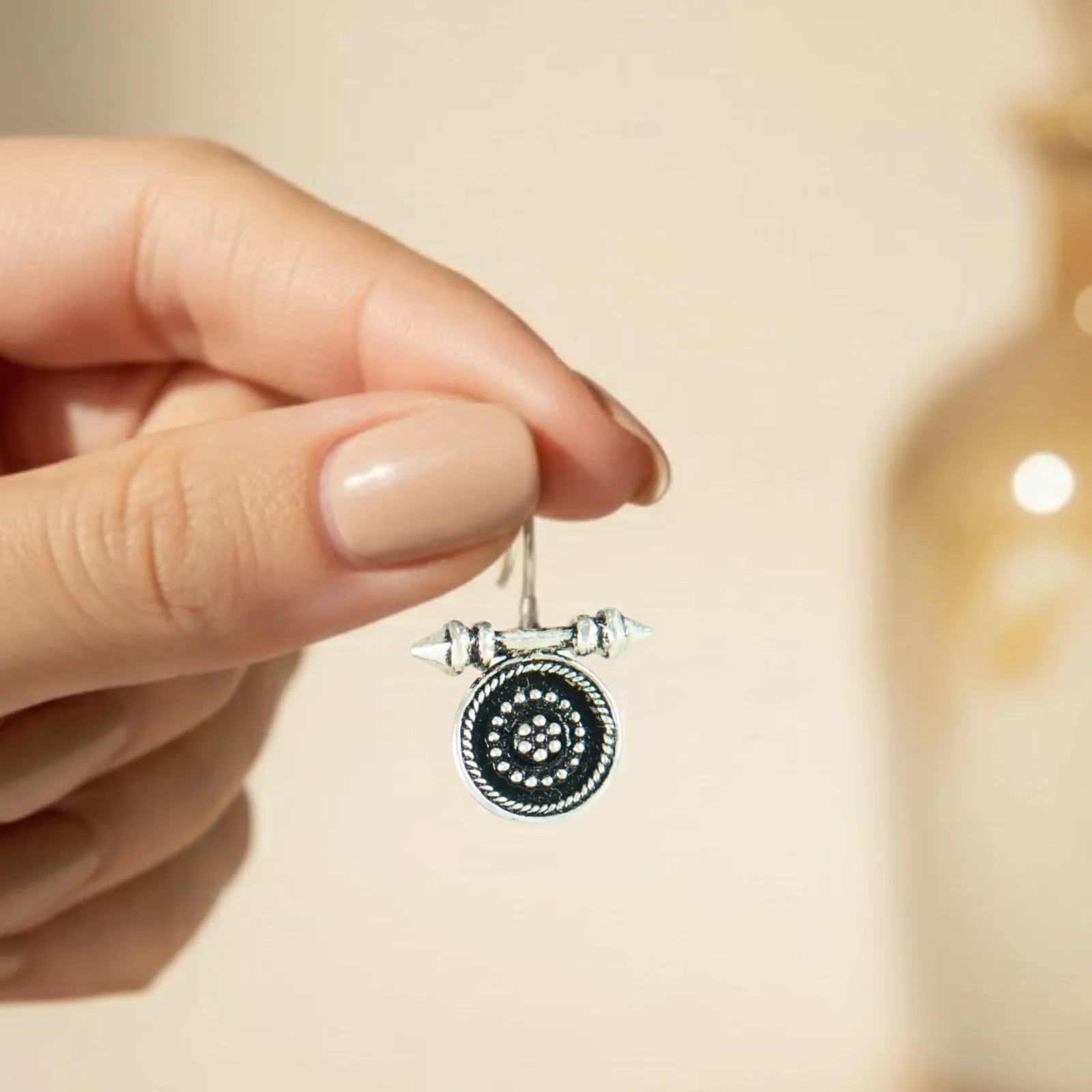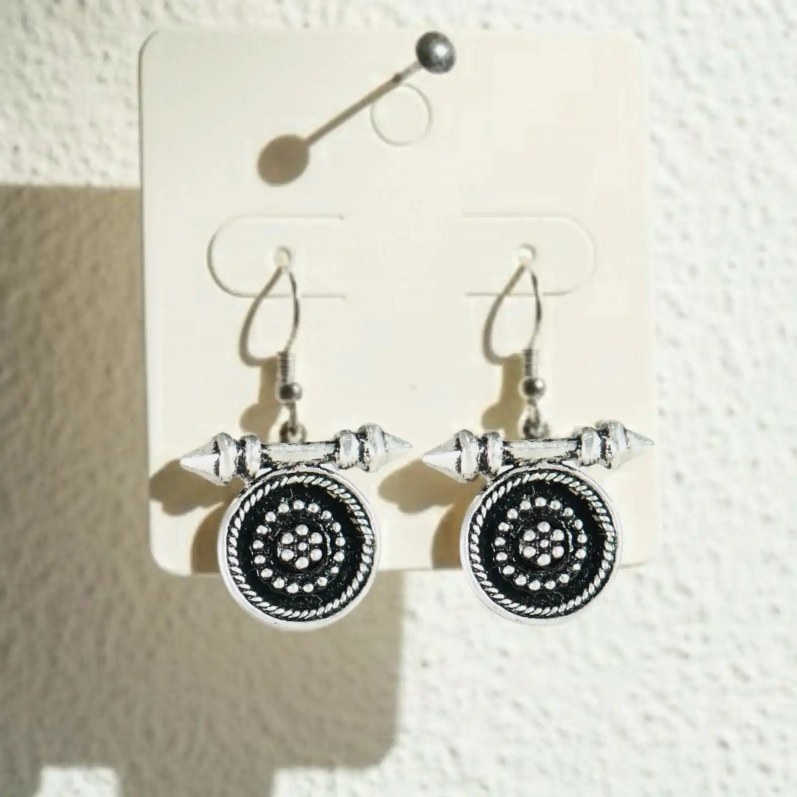 These earrings feature a round black center detailed with tiny dotted patterns and framed by a twisted silver border. The top spindle element adds a handcrafted, rustic touch, giving the pair a distinct tribal charm. Lightweight and expressive, they work beautifully as everyday statement pieces. Dress Pairing Suggestions • Pair them with cotton kurtis, printed boho tops, or earthy-toned maxi dresses. • They also match well with denim jackets, solid-color tunics, and casual ethnic wear. • For a more festive vibe, combine them with mirror-work or embroidered outfits to highlight their handcrafted feel.