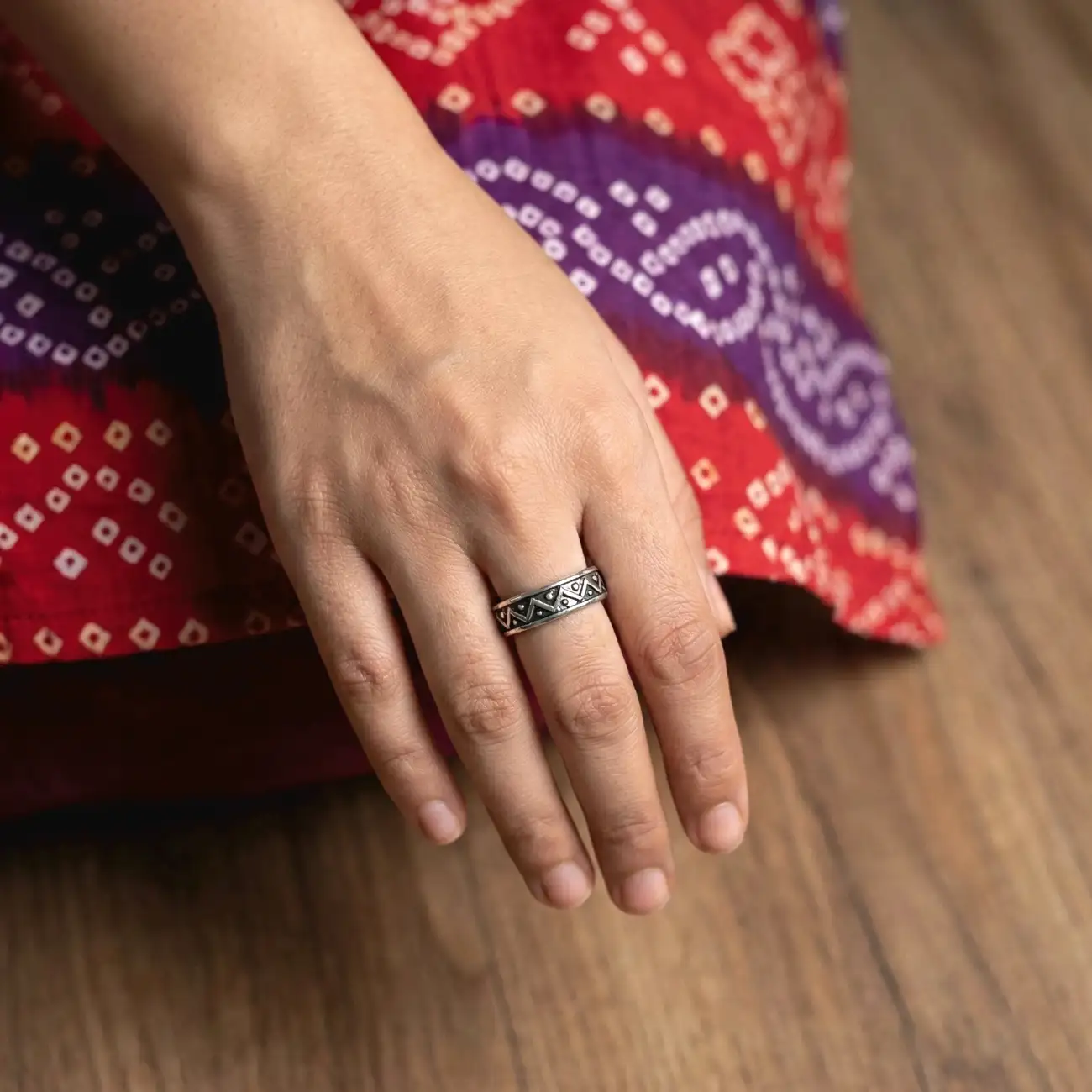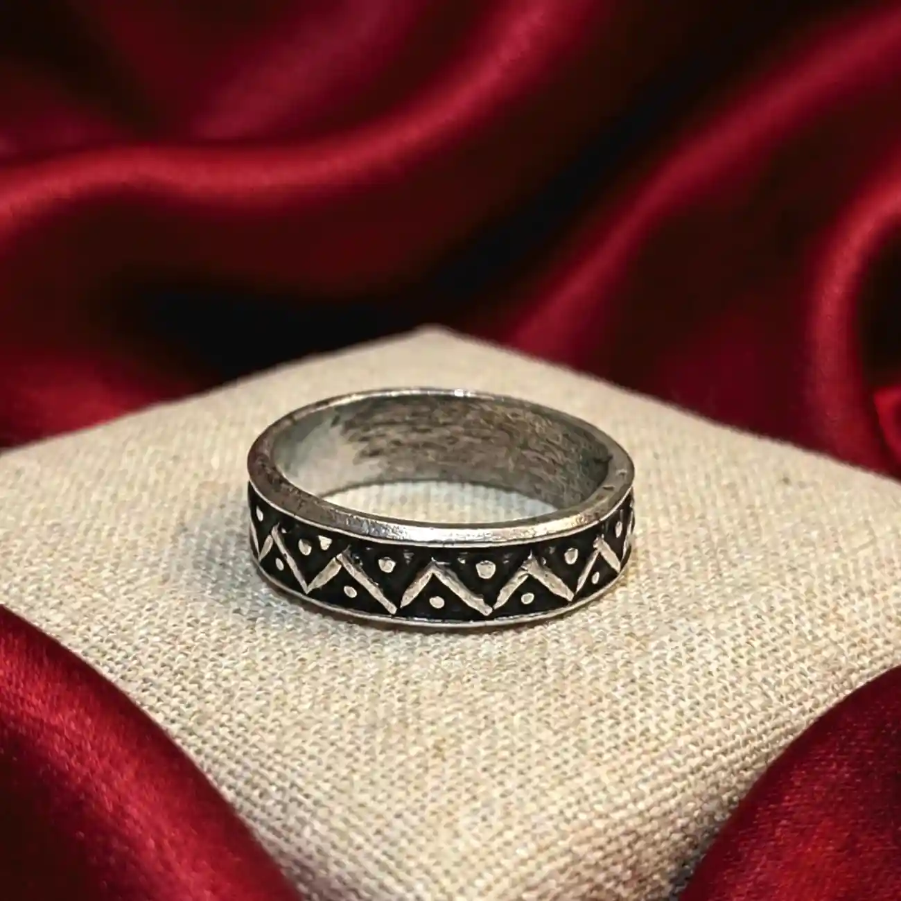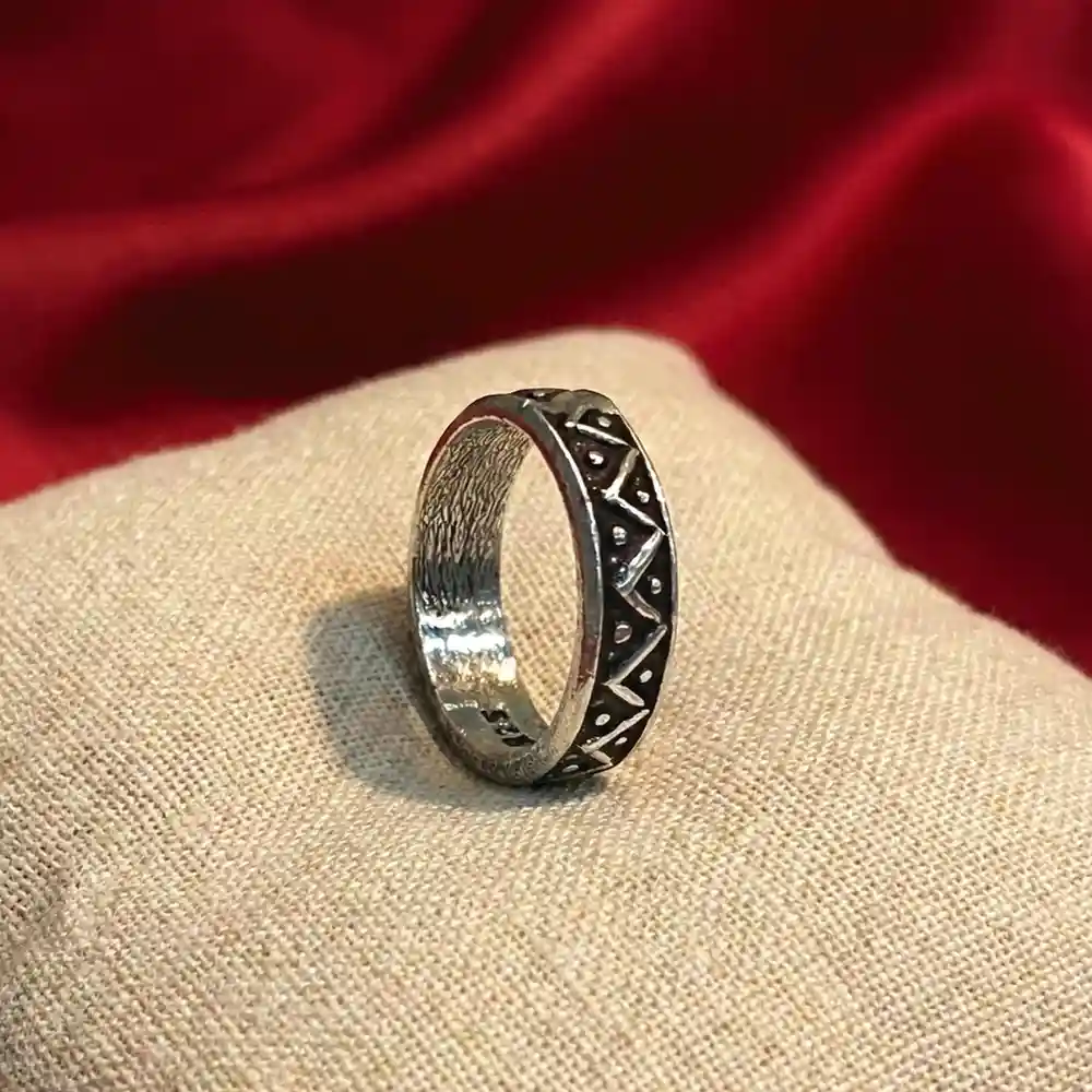 Product Type: Silver Ring Metal: 925 Sterling Silver Design: Tribal Zigzag Oxidised Silver Band Ring Size: 6 (Steel Ring Size) Style: Tribal | Boho Occasion: Daily wear, casual styling A finely crafted silver band ring featuring a rhythmic zigzag pattern accented with tiny dotted details, finished in a rich oxidised tone. Inspired by tribal geometry and traditional metal artistry, the design feels bold yet balanced. Its smooth inner band ensures comfortable wear, while the detailed exterior adds character and depth to everyday styling. Dress pairing: • Indian outfits like bandhani or ikat kurtis, cotton sarees, and fusion wear • Western looks with boho dresses, casual tops, or earthy-toned outfits • Complements reds, blacks, browns, indigo, and neutral palettes • Ideal for daily wear, cultural outings, casual styling, and minimal festive looks