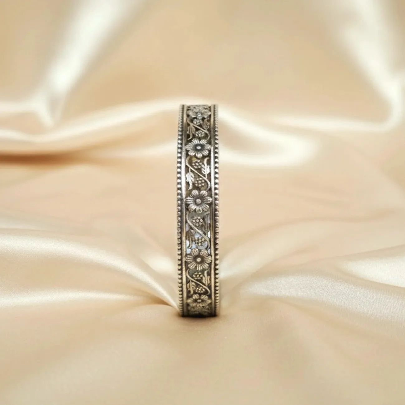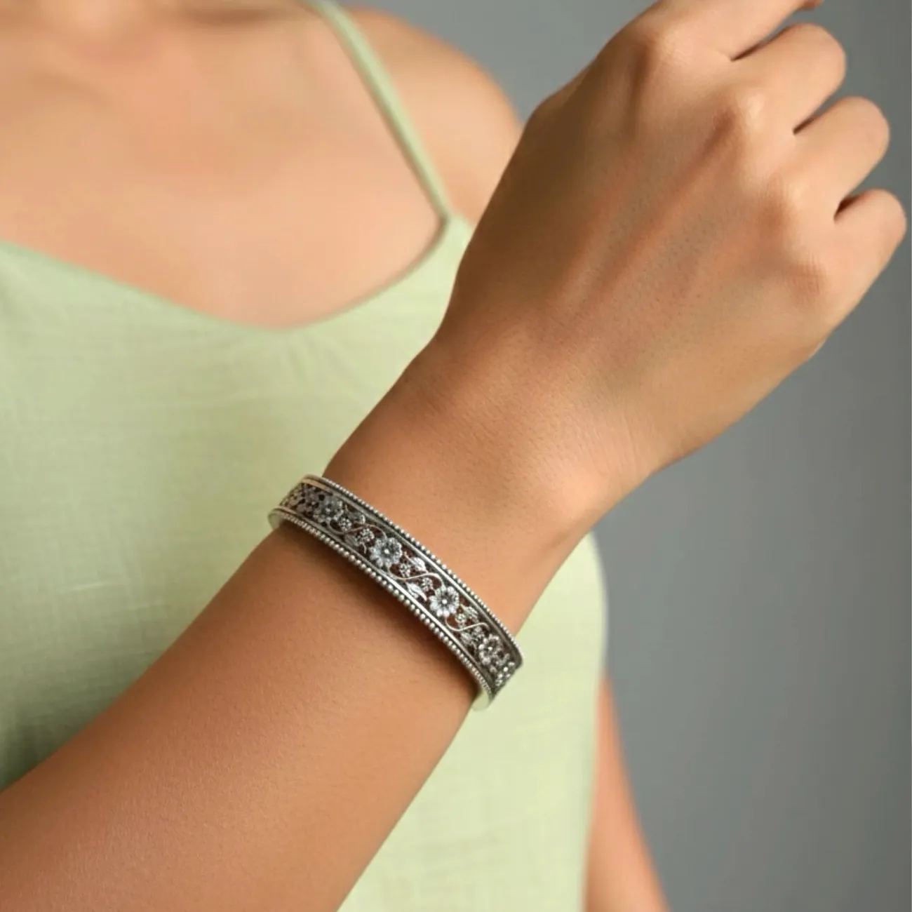 A beautifully crafted silver cuff featuring delicate floral engravings intertwined with soft vine patterns. The beaded border adds a refined vintage charm, making this piece both elegant and timeless. Its narrow, structured design rests comfortably on the wrist, adding a subtle yet captivating sparkle to any outfit. Dress pairing: • Traditional wear—silk sarees, pastel kurtas, chikankari sets • Indo-western dresses and solid co-ords for a graceful accent • Casual everyday looks like linen tops, cotton dresses, and flowy skirts • Festive ensembles paired with matching oxidised earrings or necklaces