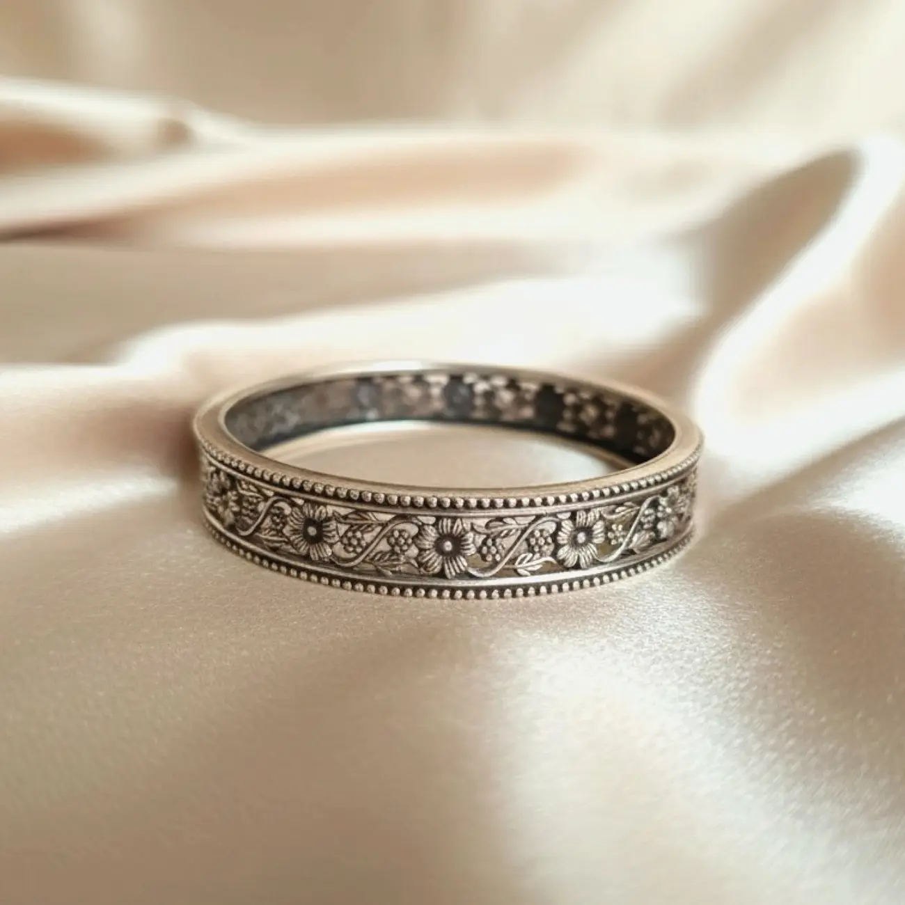 A beautifully crafted silver cuff featuring delicate floral engravings intertwined with soft vine patterns. The beaded border adds a refined vintage c...
