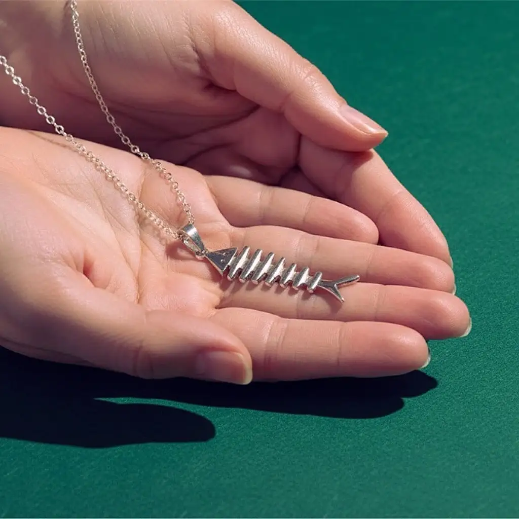 Add a quirky twist to your look with this handcrafted silver fishbone pendant chain. Designed with artistic precision, the pendant showcases a modern,...