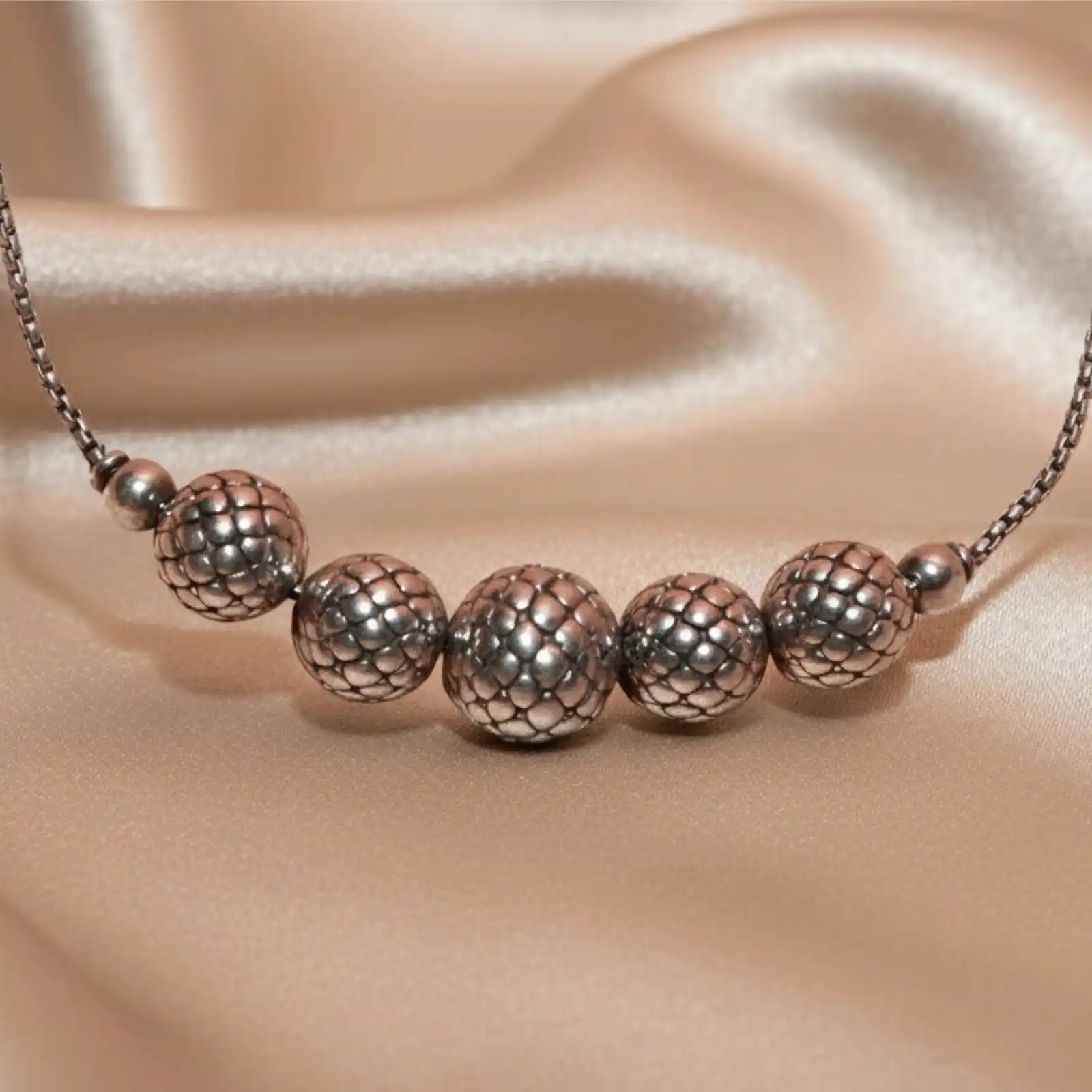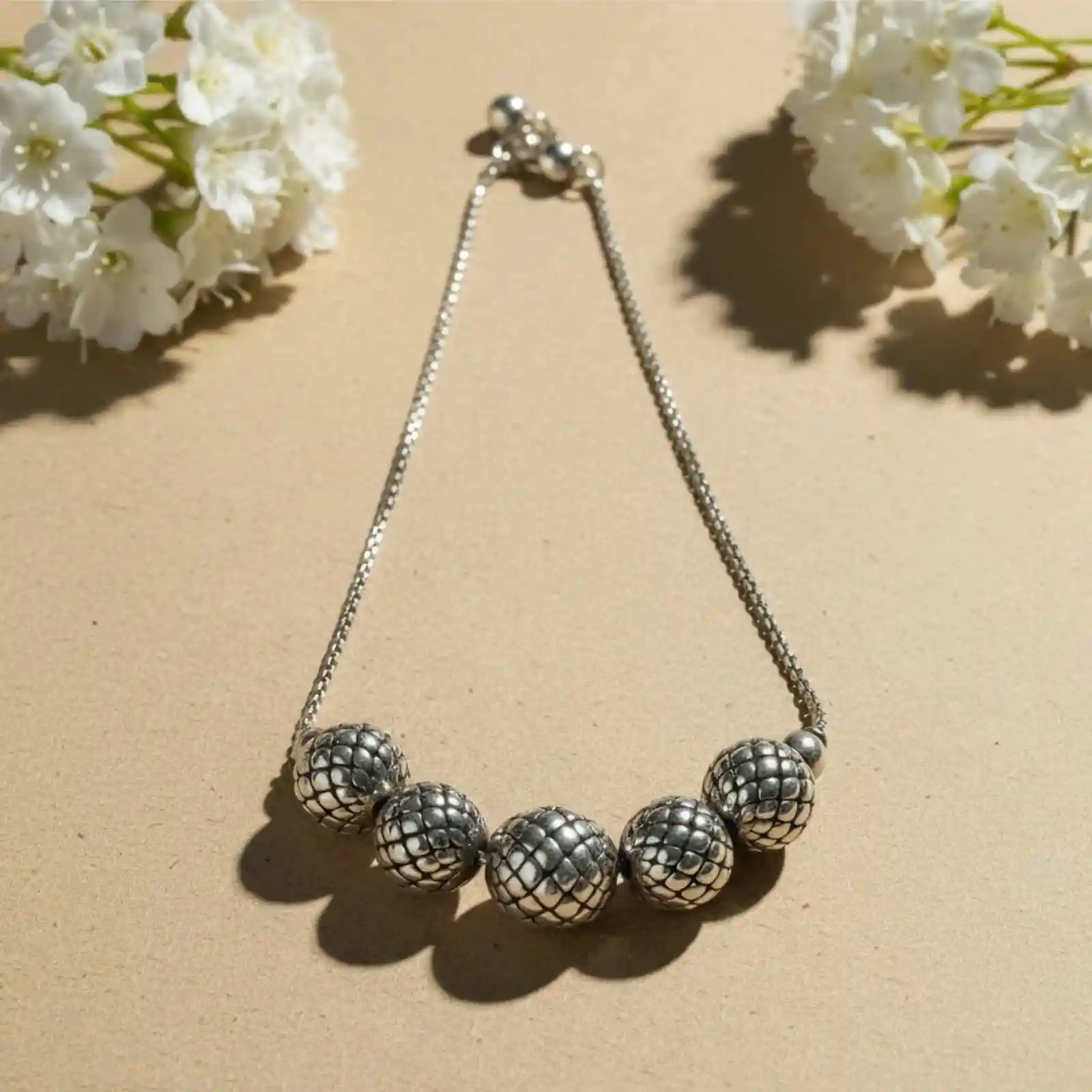 Embrace minimalist charm with the Oxidized Silver Textured Bead Bracelet from Mahanam Jewellers. Featuring a series of intricately carved oxidized beads strung on a delicate adjustable chain, this bracelet beautifully blends modern simplicity with traditional craftsmanship. Its subtle sheen and antique finish make it an effortlessly stylish accessory suitable for both daily wear and festive occasions. Highlights: • Handcrafted oxidized silver bracelet with textured beads • Adjustable chain for a comfortable fit • Lightweight and elegant design • Ideal for casual, ethnic, or contemporary outfits • A perfect gift for someone special
