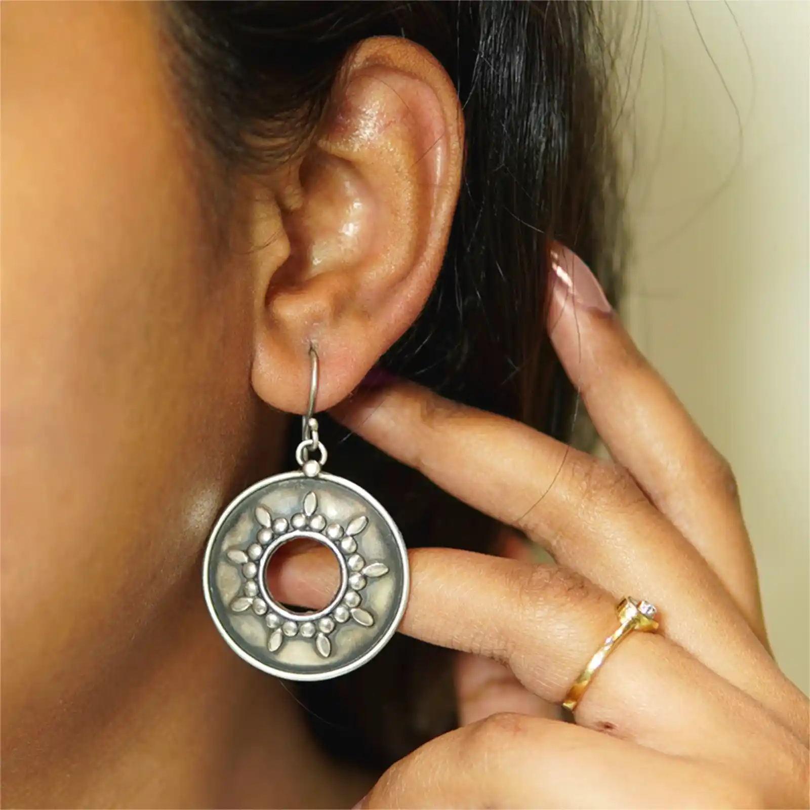 These antique-finish silver drop earrings feature a timeless circular design adorned with a raised floral motif. The oxidised detailing adds depth and...