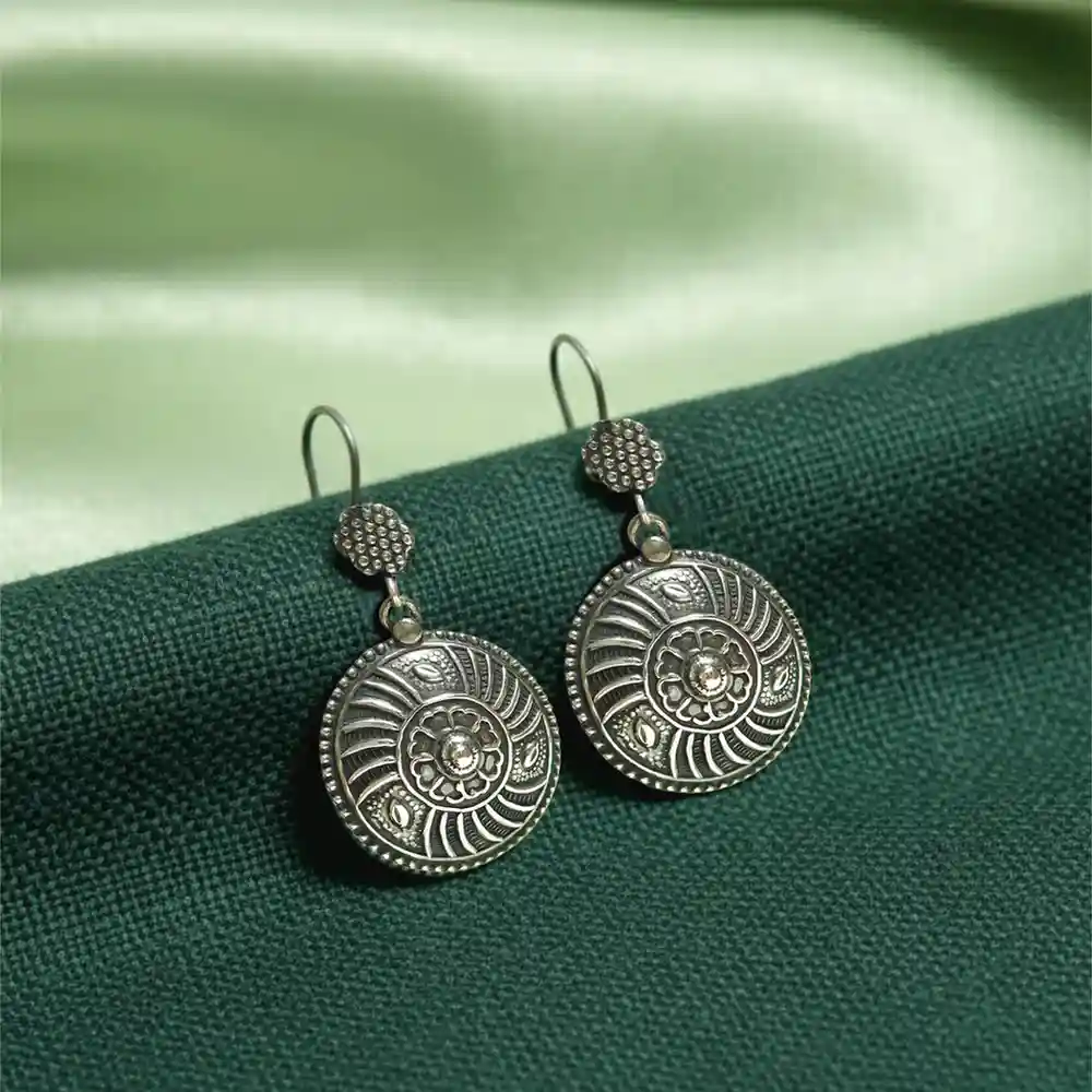 These elegant silver drop earrings feature a beautifully engraved circular motif with a detailed floral centre and graceful spiral accents. Lightweight and artistic, they add a refined traditional touch to both ethnic and Indo-western outfits.
