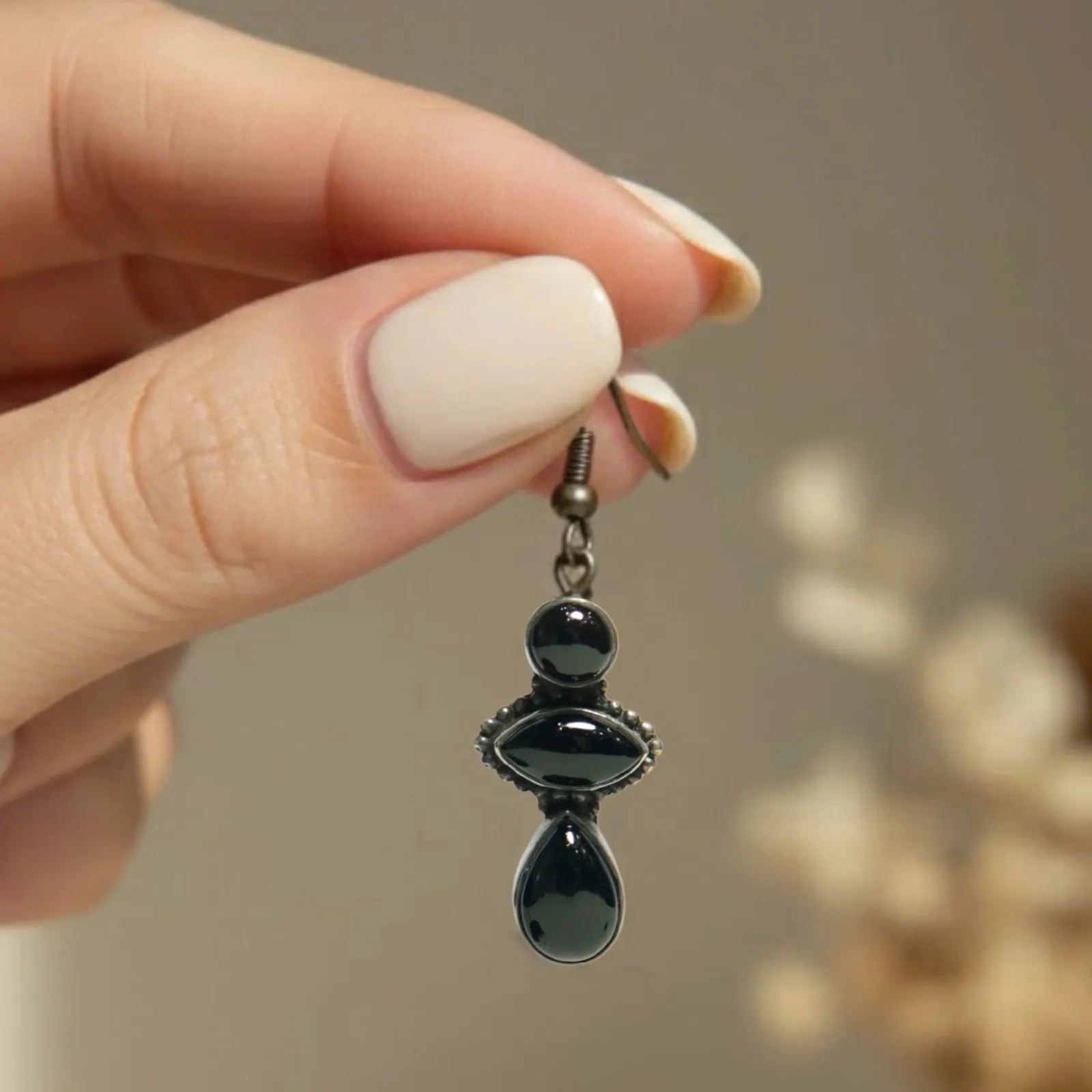 These elegant silver earrings feature a trio of glossy black stones in round, marquise, and teardrop shapes, creating a sleek and timeless silhouette. Their refined contrast makes them perfect for pairing with black sarees, evening gowns, solid kurta sets, or any monochrome outfit where you want a touch of understated sophistication.