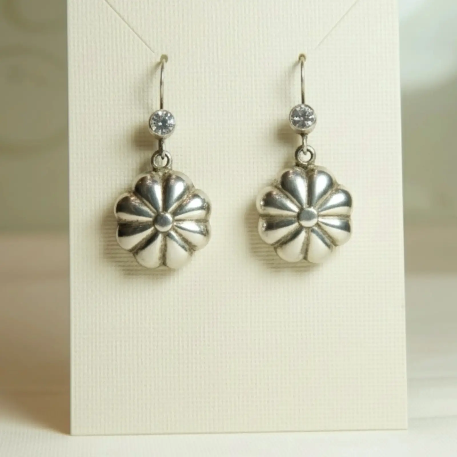 These earrings feature softly sculpted flower-shaped charms that hang from a delicate hook, each topped with a clear, round accent that adds a gentle ...