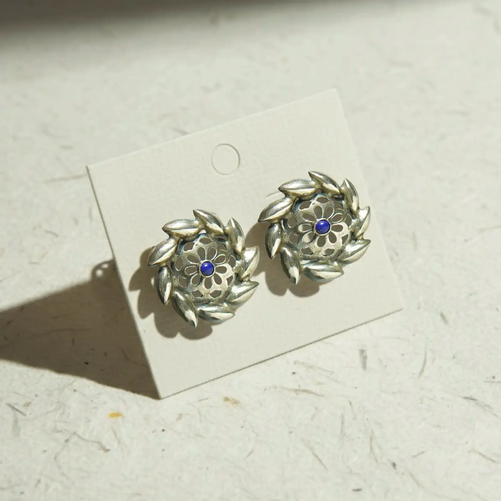 These round stud earrings feature a delicate floral center framed by layered petal motifs, giving them the look of a miniature wreath. A subtle blue accent stone sits at the core, adding a gentle touch of color without overpowering the refined silver finish. Lightweight and graceful, they bring a soft, feminine charm to both daily wear and special occasions. Dress-Pairing Suggestions • Pair with pastel kurtas, chiffon sarees or soft-tone salwar suits for a graceful daytime look. • Works beautifully with maroon, navy, lavender or cream dresses for an understated yet polished style. • For Western outfits, pair with flowy tops, linen dresses or elegant blouses to add a hint of artisanal charm.