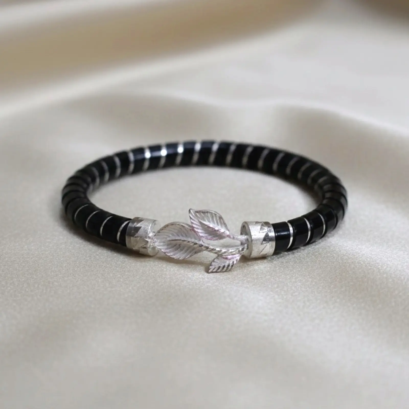 This elegant black Pola bangle features a finely carved silver-tone cluster of leaves, adding a soft, organic charm to its sleek and polished look. The deep black finish creates a striking contrast against the detailed leaf motif, making it perfect for both everyday elegance and festive wear. It pairs beautifully with traditional sarees—especially white, red, black, gold, and deep green—or with simple kurtis and salwar suits for a refined, graceful touch.