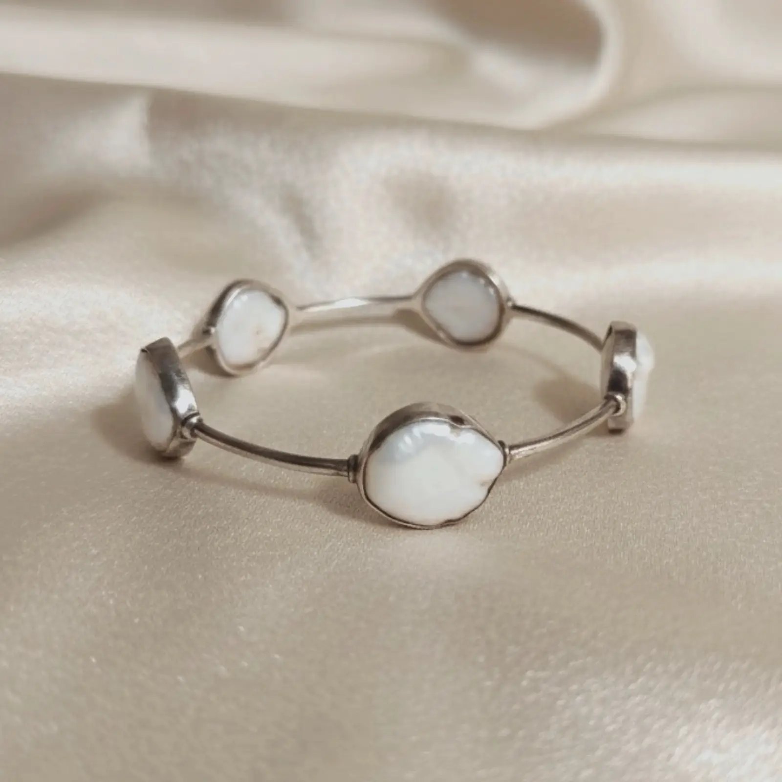 This elegant bracelet features smooth sky-blue stones set in a clean, minimal silver-tone frame, creating a fresh and calming aesthetic. The soft past...