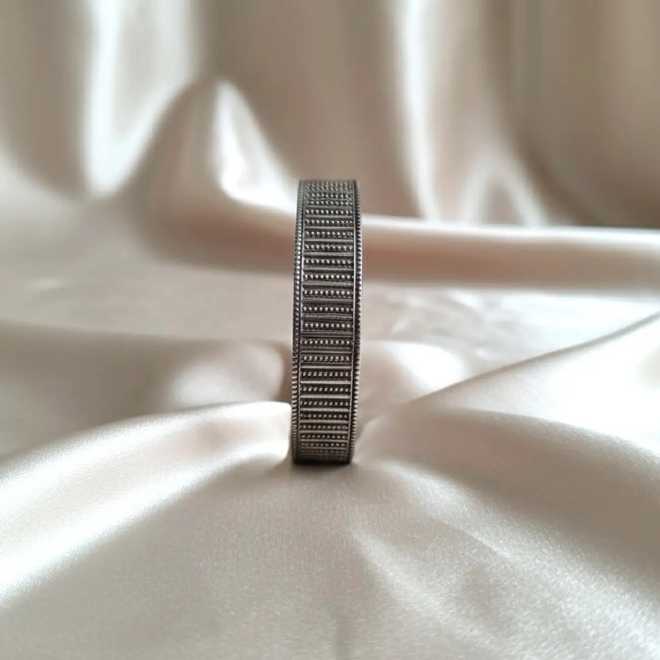 A sleek silver cuff featuring a modern vertical-line pattern accentuated with tiny beaded detailing. The contrast of dark grooves and raised silver be...