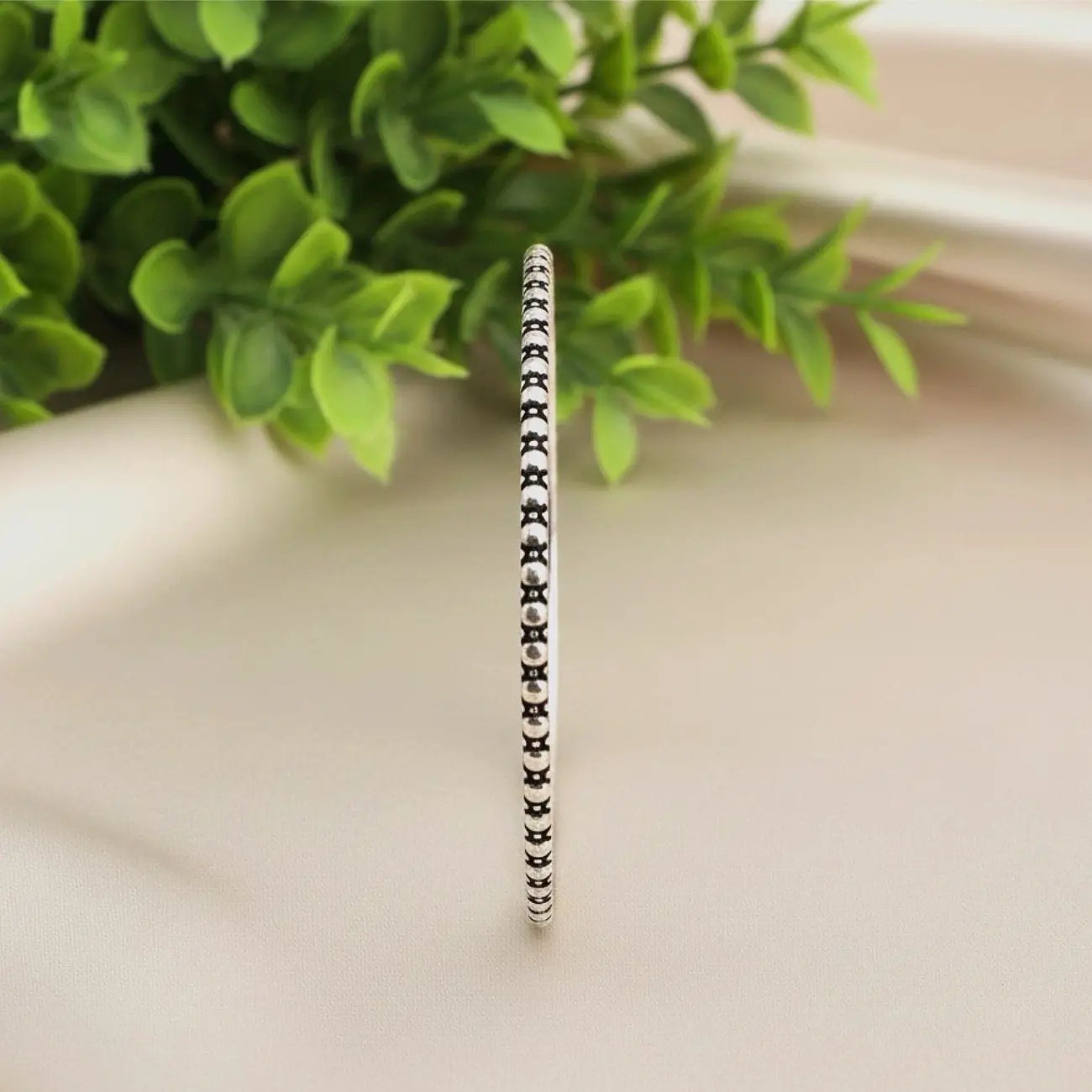 A delicate pair of silver bangles crafted with a fine row of mini bead detailing around the entire circumference. Their slim, minimal design makes them perfect for everyday wear, while the textured oxidised finish adds a touch of handcrafted charm. Lightweight, stackable, and versatile, these bangles complement both simple and ornate looks with ease. Dress pairing: • Daily wear—cotton kurtas, printed dresses, and soft pastel outfits • Traditional attire—handloom sarees, salwar suits, and festive kurtas • Western casuals—denim, tank tops, linen shirts for a chic fusion touch • Beautiful for stacking with broader silver cuffs or multiple thin bangles