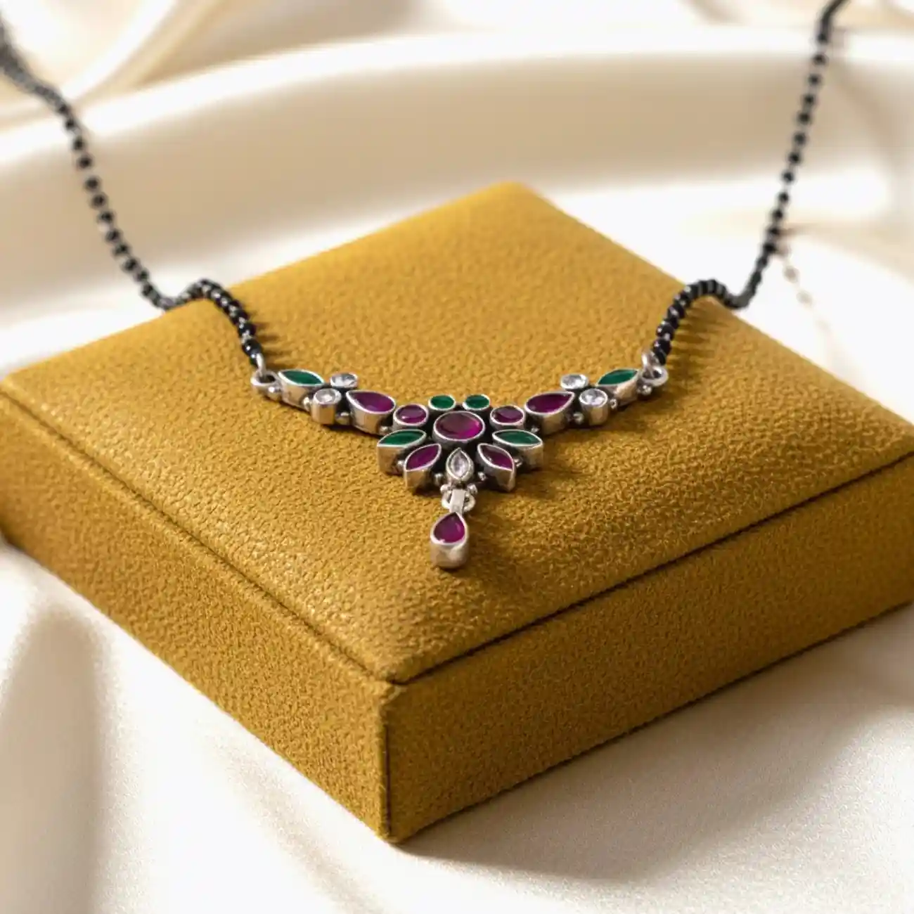 A delicate silver mangalsutra featuring a floral-inspired pendant highlighted with deep ruby and emerald-toned stones, accented by subtle white crystal details. The soft drop at the center adds a graceful finish, making this piece a beautiful blend of colour, tradition, and refined elegance—perfect for women who love understated yet festive jewellery. Dress pairing: • Printed cotton kurtas, bandhni and handblock outfits in jewel tones • Soft silk or chiffon sarees with minimal borders • Pairs effortlessly with festive daywear and elegant everyday ethnic looks
