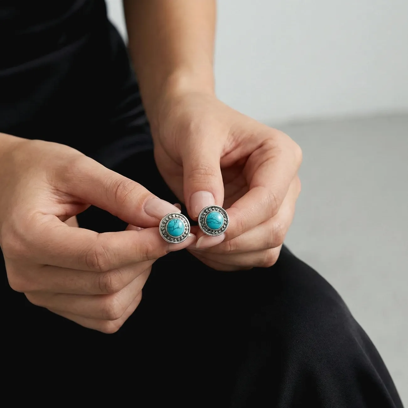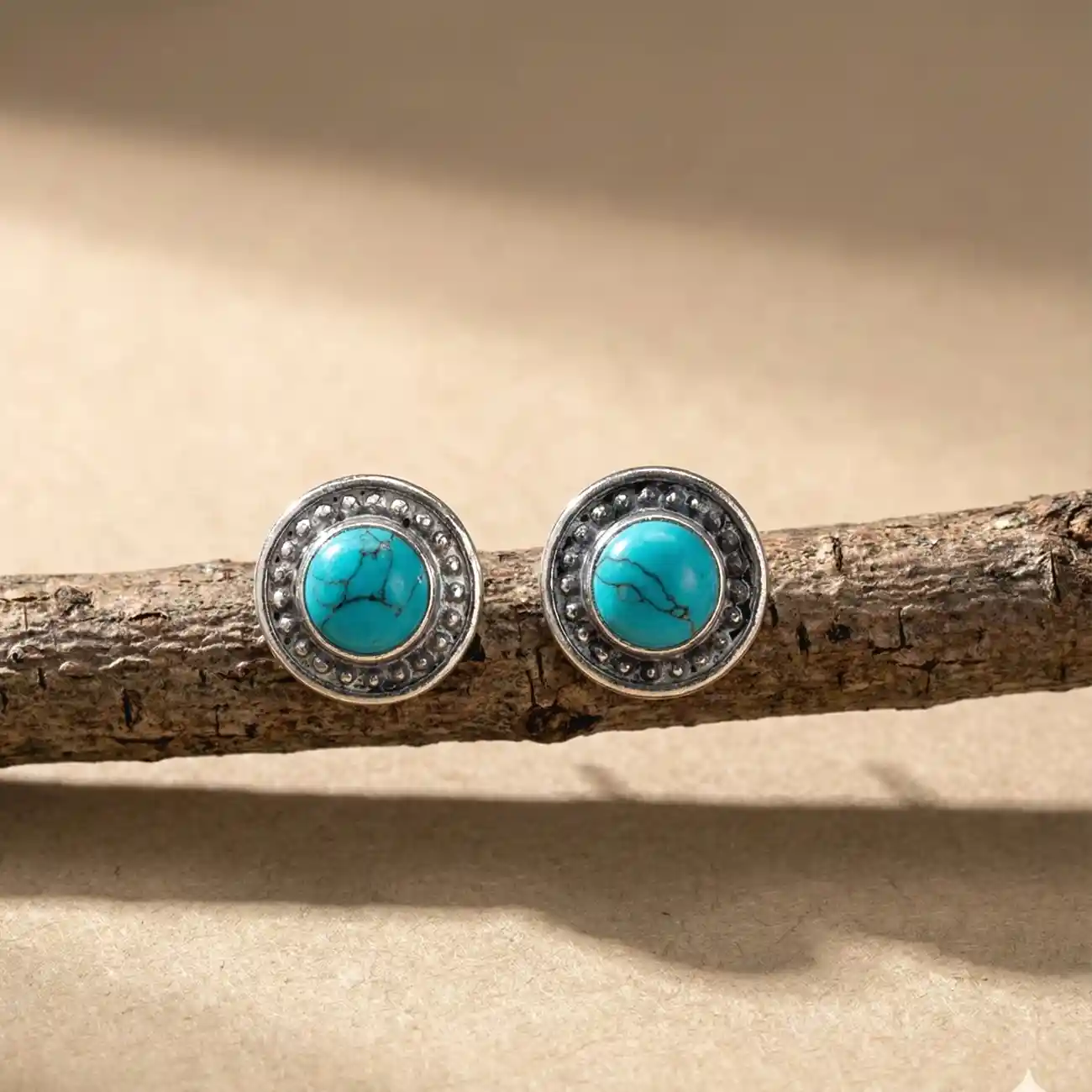 A pair of round silver studs featuring a serene sky-blue stone at the center, encircled by a finely detailed beaded halo. The natural veining of the stone adds organic character, while the oxidised silver border gives the design a balanced, artisanal finish. Elegant yet easy to wear, these studs bring a fresh pop of colour to everyday looks. Dress pairing: • Handloom cotton kurtas, printed summer dresses, block-print outfits • White shirts, pastel tops, breezy linen ensembles • Complements turquoise, ivory, beige, and soft earthy tones for a calm, refined finish