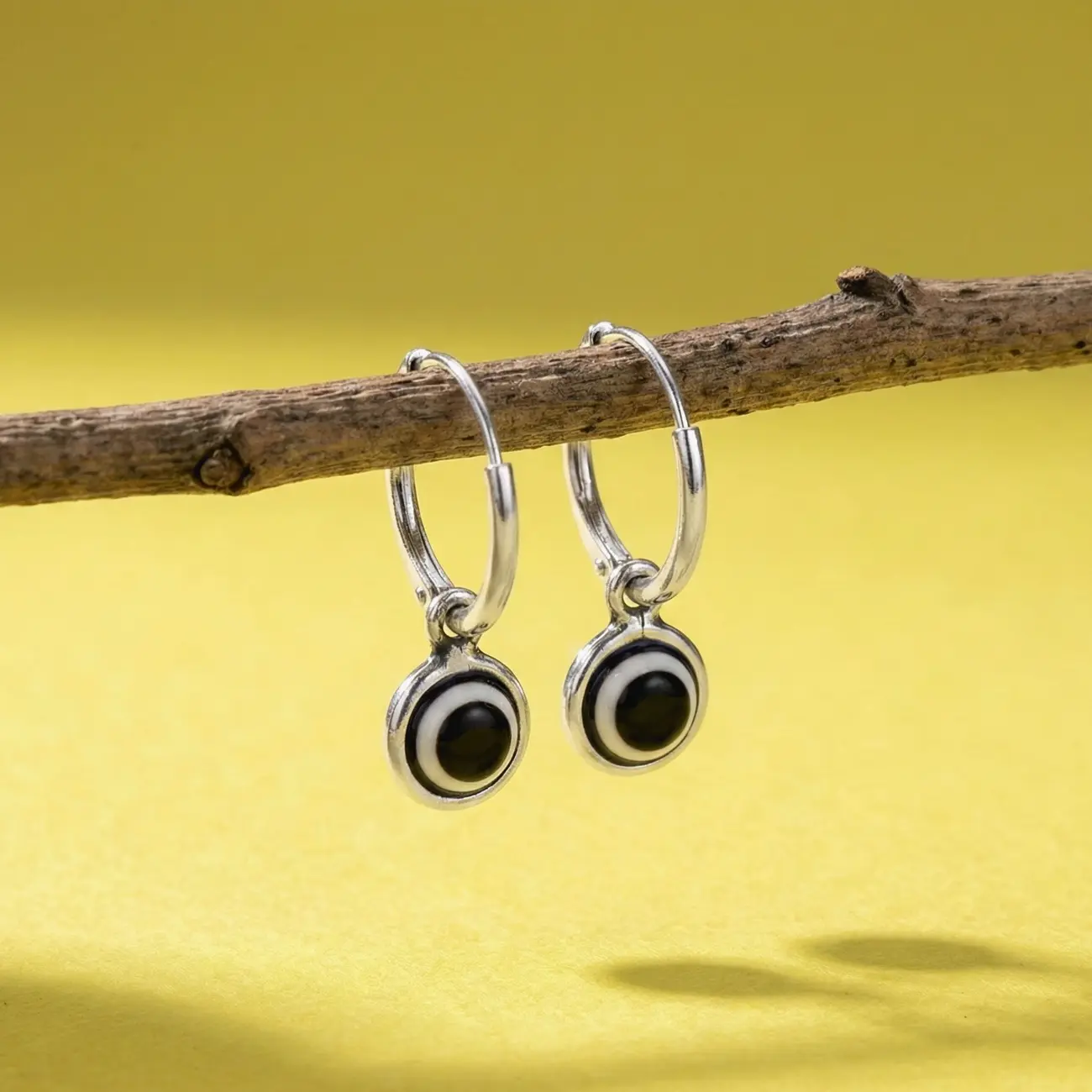 A refined pair of silver hoop earrings featuring a subtle evil-eye charm suspended below. The classic black-and-white eye motif adds a touch of symbol...