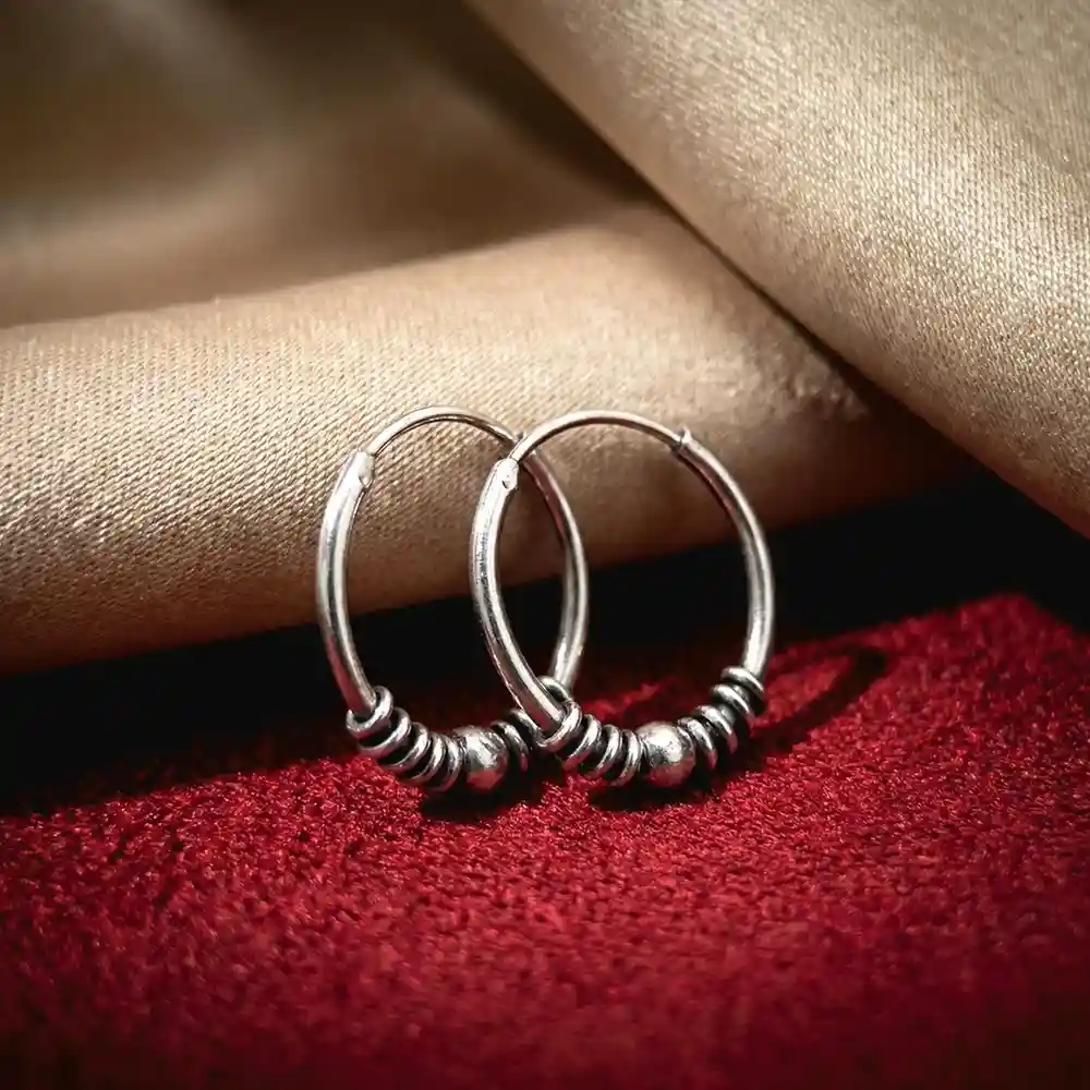 A delicately handcrafted pair of silver bali hoops featuring layered bead detailing arranged in a rhythmic pattern along the lower curve. The mix of smooth silver balls and fine spacer rings creates a balanced play of texture, giving these earrings a soft yet distinctive artisanal character. Easy to wear and timeless in appeal, they transition effortlessly from daily wear to relaxed festive moments. Dress pairing: • Handloom cotton sarees, printed kurtas, sleeveless ethnic blouses • Casual dresses, linen co-ords, Indo-western outfits • Pairs beautifully with warm neutrals, maroon, dusty pinks, olive, and classic black for an elegant everyday look