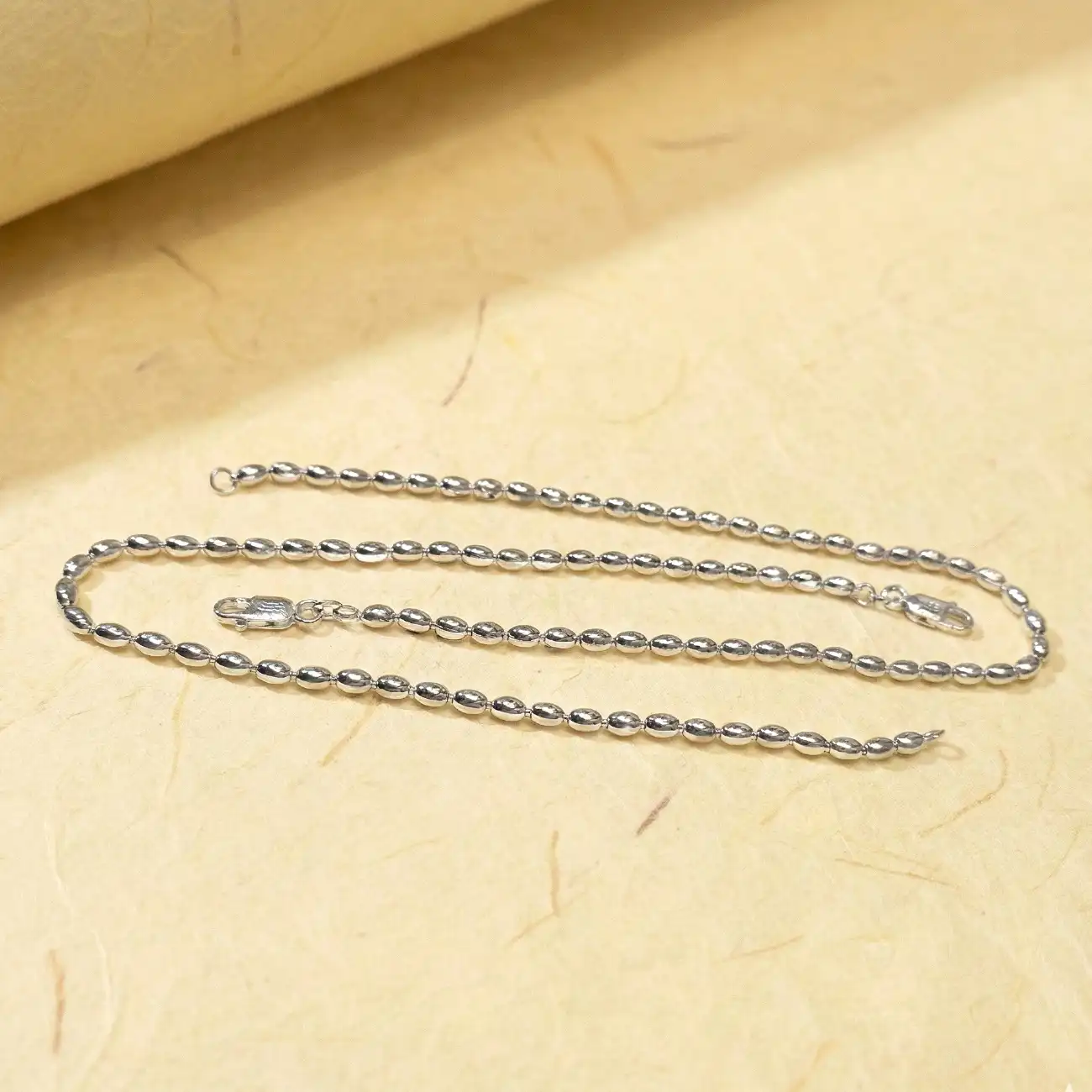 A graceful pair of silver payels crafted with smooth, oval bead links that create a soft rhythm around the ankle. Lightweight yet elegant, the design reflects subtle shine and fluid movement, making it perfect for everyday wear as well as understated festive looks. The minimal silhouette ensures comfort while adding a refined traditional touch to your step. Dress pairing: Cotton sarees, linen sarees, and handloom drapes Ankle-length kurtas, palazzos, and straight-fit pants Summer dresses, ethnic skirts, and Indo-western outfits Complements soft pastels, earthy neutrals, whites, and warm tones beautifully