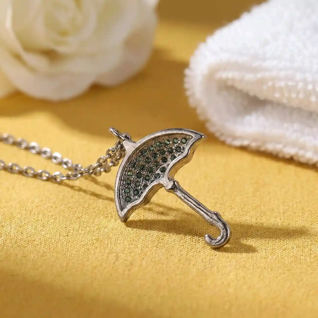 Jewellery Type: Pendant with Chain Metal: 925 Sterling Silver Stone: Green crystal / emerald-tone stone detailing Chain Type: Sterling silver chain (included) Occasion: Daily wear, casual outings, gifting, festive styling Style: Minimal, symbolic, contemporary A charming umbrella-shaped pendant adorned with finely set green stone accents on the canopy, paired with a sleek silver-tone chain. The playful yet elegant design symbolises protection, hope, and positivity, making it a unique statement piece for everyday wear. Its polished finish and delicate detailing give it a fresh, youthful appeal that effortlessly complements modern styling. Dress pairing: • Casual looks like solid tops, summer dresses, camisoles, and denim jackets • Indian wear such as simple kurtis, cotton suits, and light festive outfits • Western outfits in white, green, beige, or pastel shades • Perfect for monsoon-inspired styling, daily wear, or thoughtful gifting