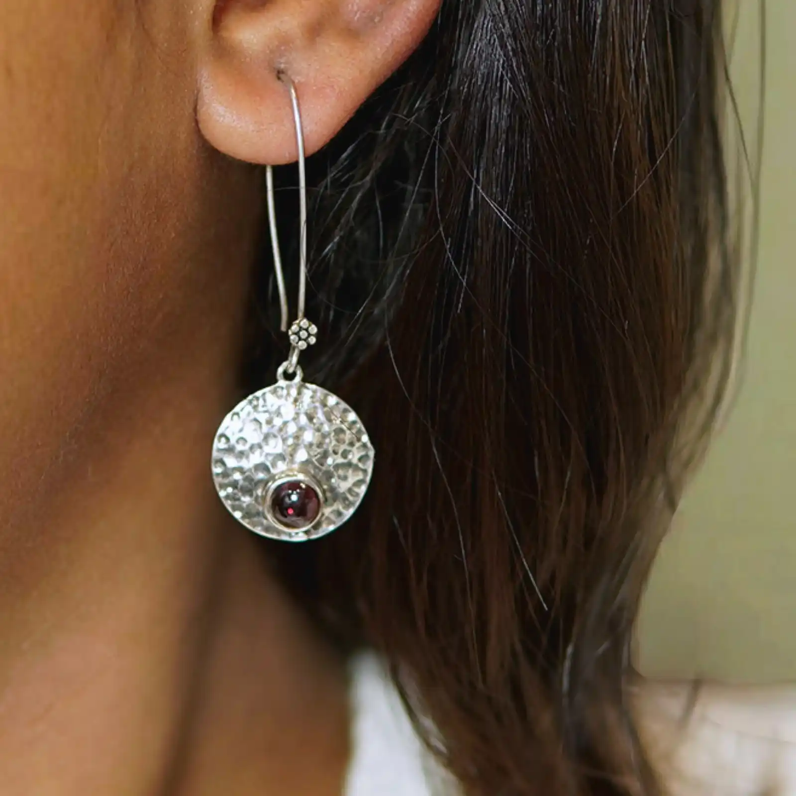 These handcrafted earrings blend raw texture with refined beauty. The hammered silver discs catch light beautifully, giving each piece a unique artisanal character. At the center lies a deep garnet gemstone, radiating warmth and strength — a perfect symbol of grounded elegance. Designed for women who love subtle statement pieces, these earrings add a hint of sophistication to casual, work, or evening wear. Each pair celebrates craftsmanship, texture, and timeless charm.