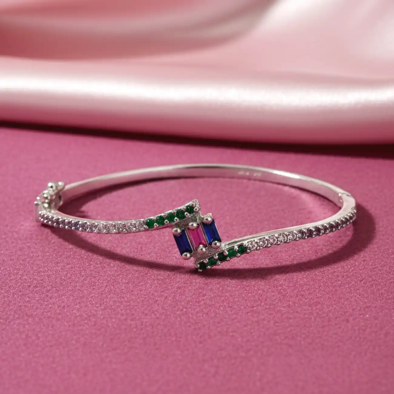 Jewellery Type: Designer Silver Bangle Stones: Blue & Pink Baguette Stones with Green and White CZ Accents Finish: High Polish with Micro Pavé Deta...